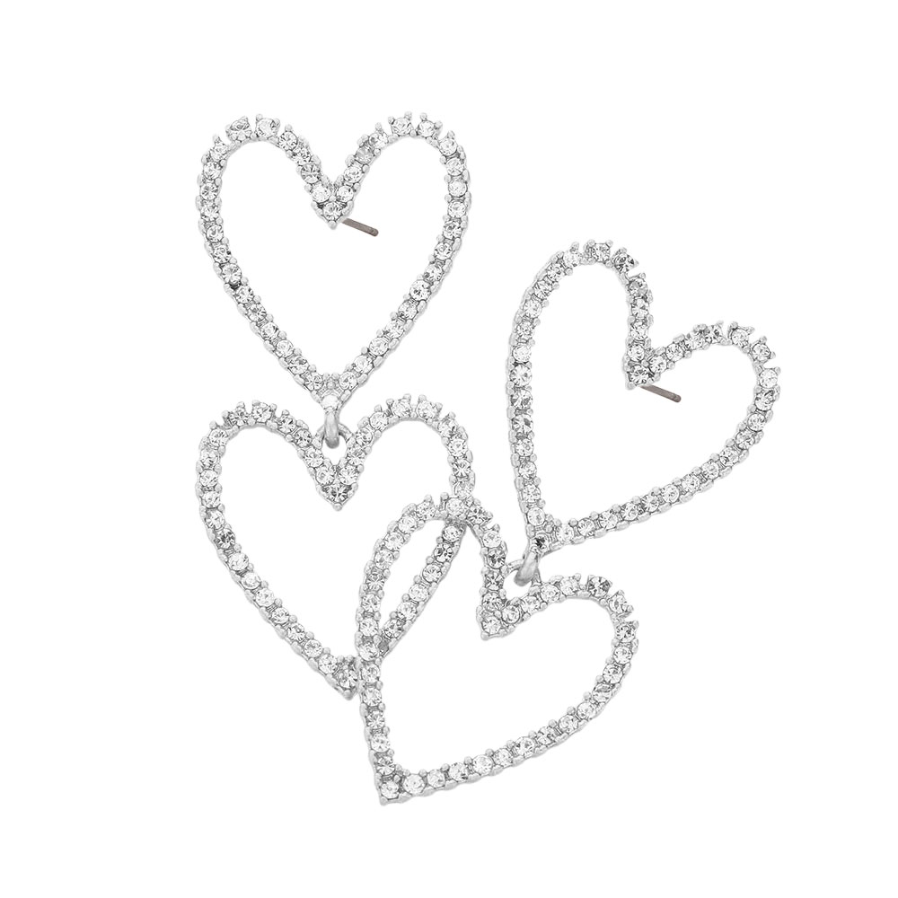 Details • Size : 1" X 2.25" • Post Back • Shine bright with these dazzling double heart drop earrings featuring sparkling rhinestone accents. Their elegant intertwined heart design adds romantic flair and playful sparkle, making them the perfect statement accessory for parties, dates, or special celebrations. • Lead and Nickel Compliant