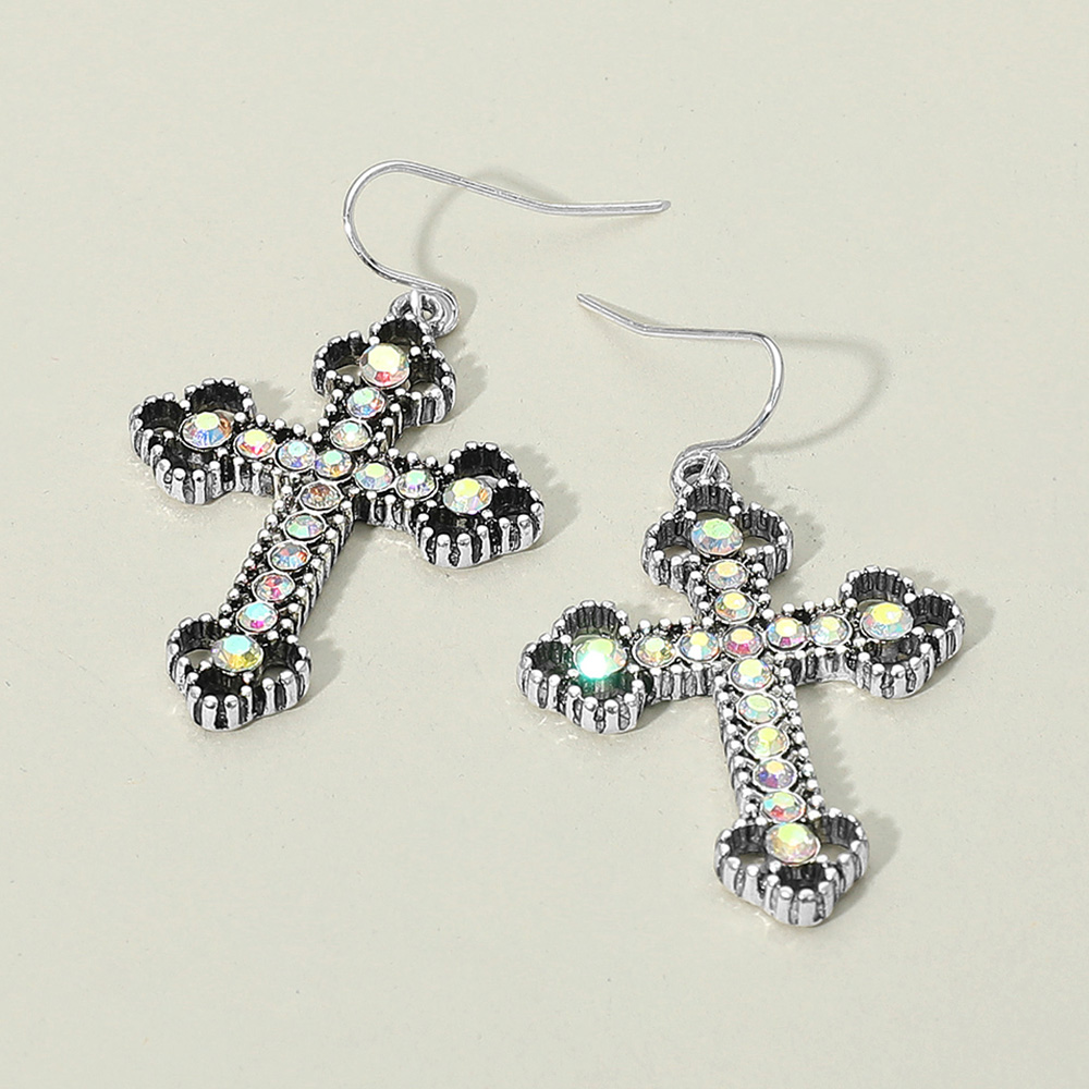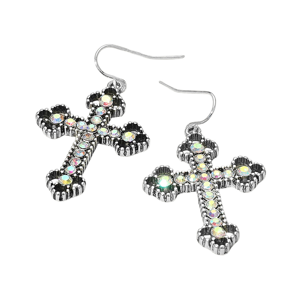 Details • Size : 1.2" X 1.75" • Fish Hook Back • Stylish drop earrings featuring cross-shaped pendants adorned with shimmering crystals and intricate vintage-inspired edging. A bold and elegant accessory perfect for adding sparkle to both casual and formal outfits. • Lead and Nickel Compliant