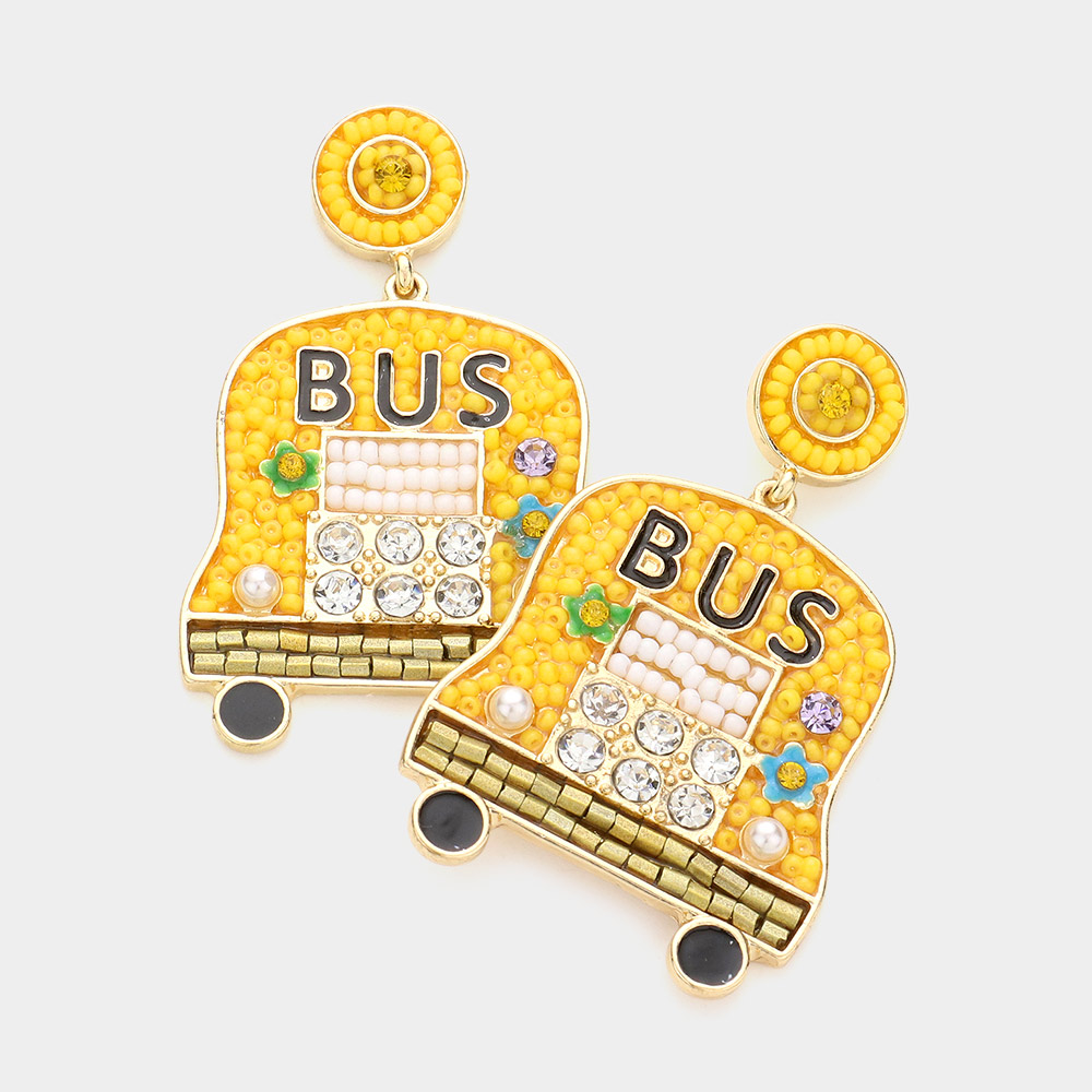 Stone Seed Bead Embellished School Bus Dangle Earrings