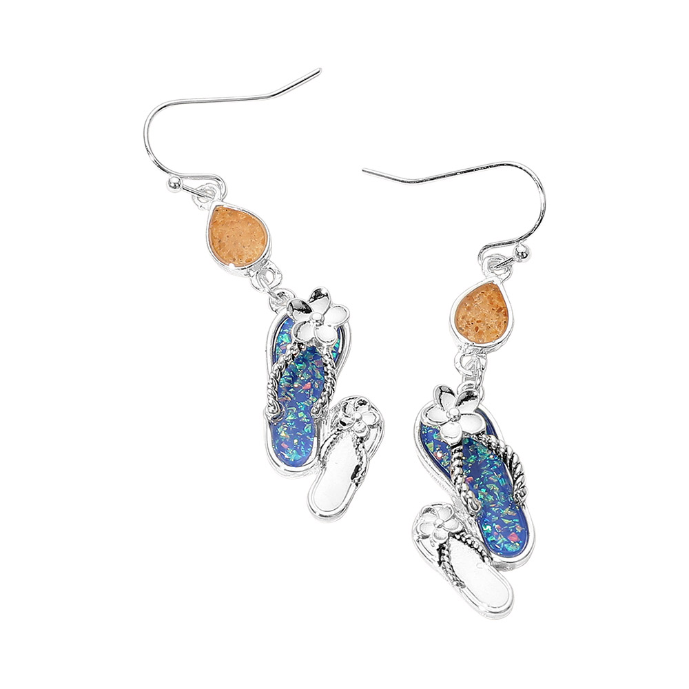 Details • Size : 0.5" X 2" • Fish Hook Back • Beach inspired flip flop charm drop earrings featuring playful movement and a relaxed coastal theme. A fun accessory for summer outfits, vacation looks, resort wear, and seaside gift assortments, adding personality and seasonal appeal while remaining lightweight and easy to style. • Lead and Nickel Compliant