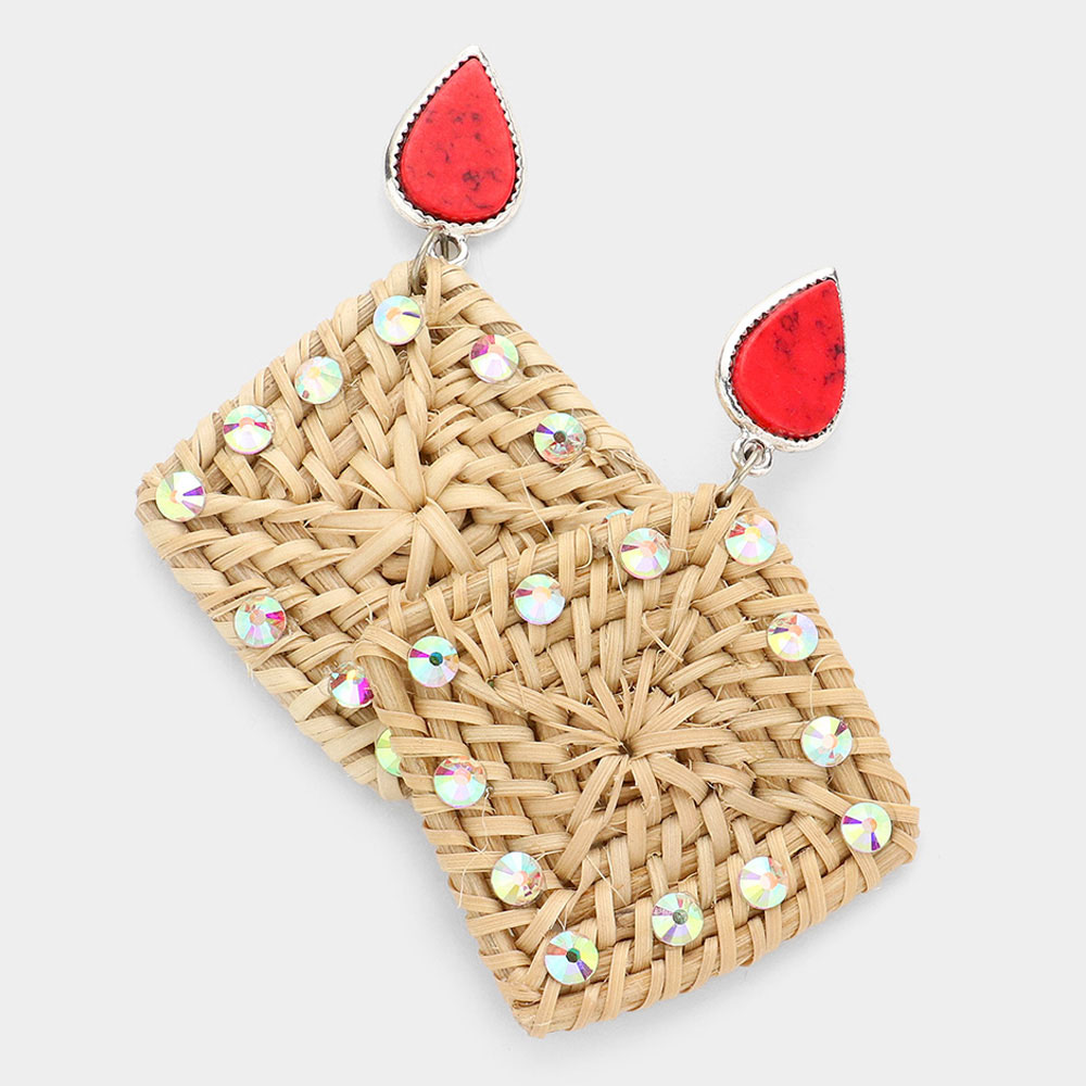 Teardrop Natural Stone Studded Woven Wood Square Link Dangle Earrings