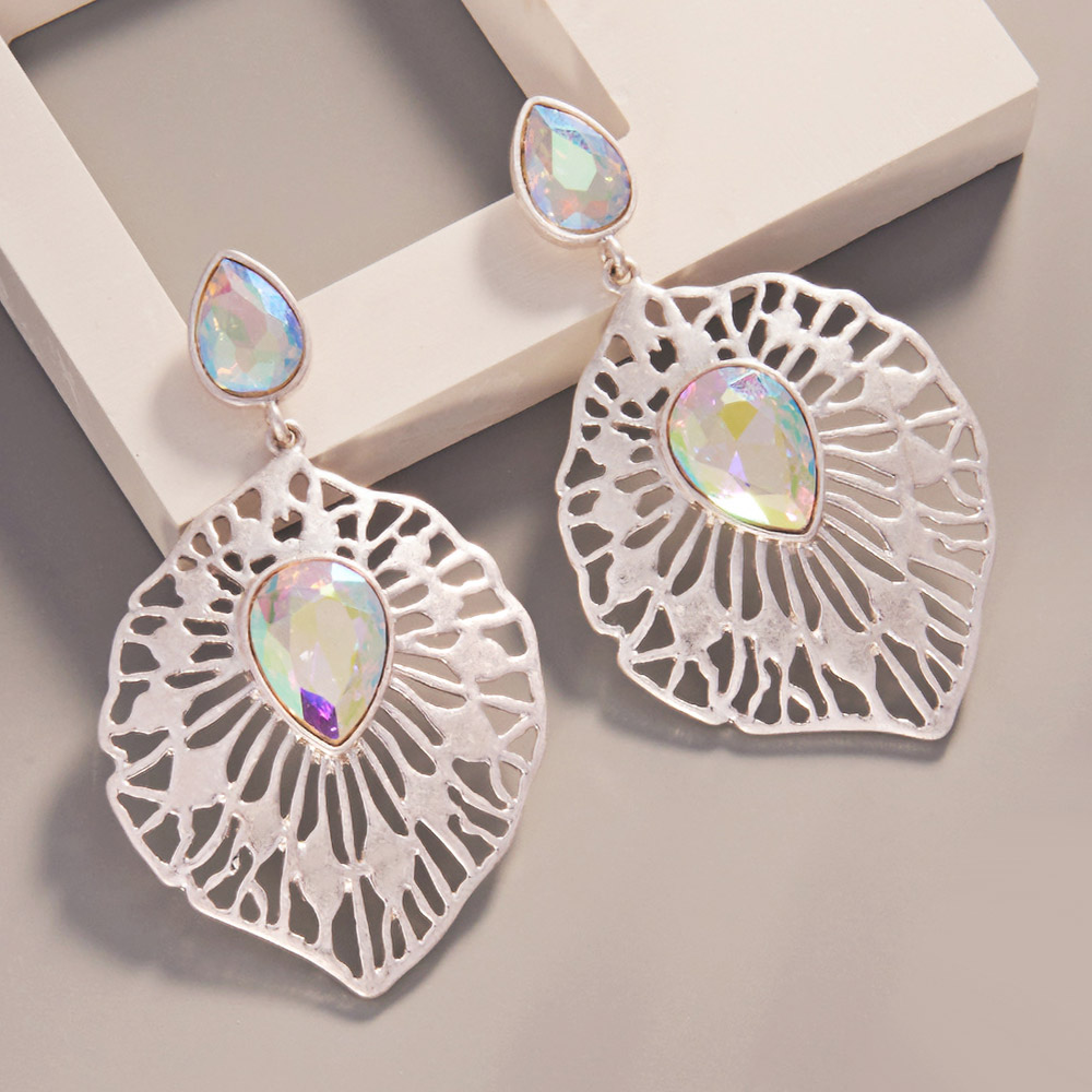 Teardrop Stone Embellished Metal Abstract Filigree Dangle Earrings