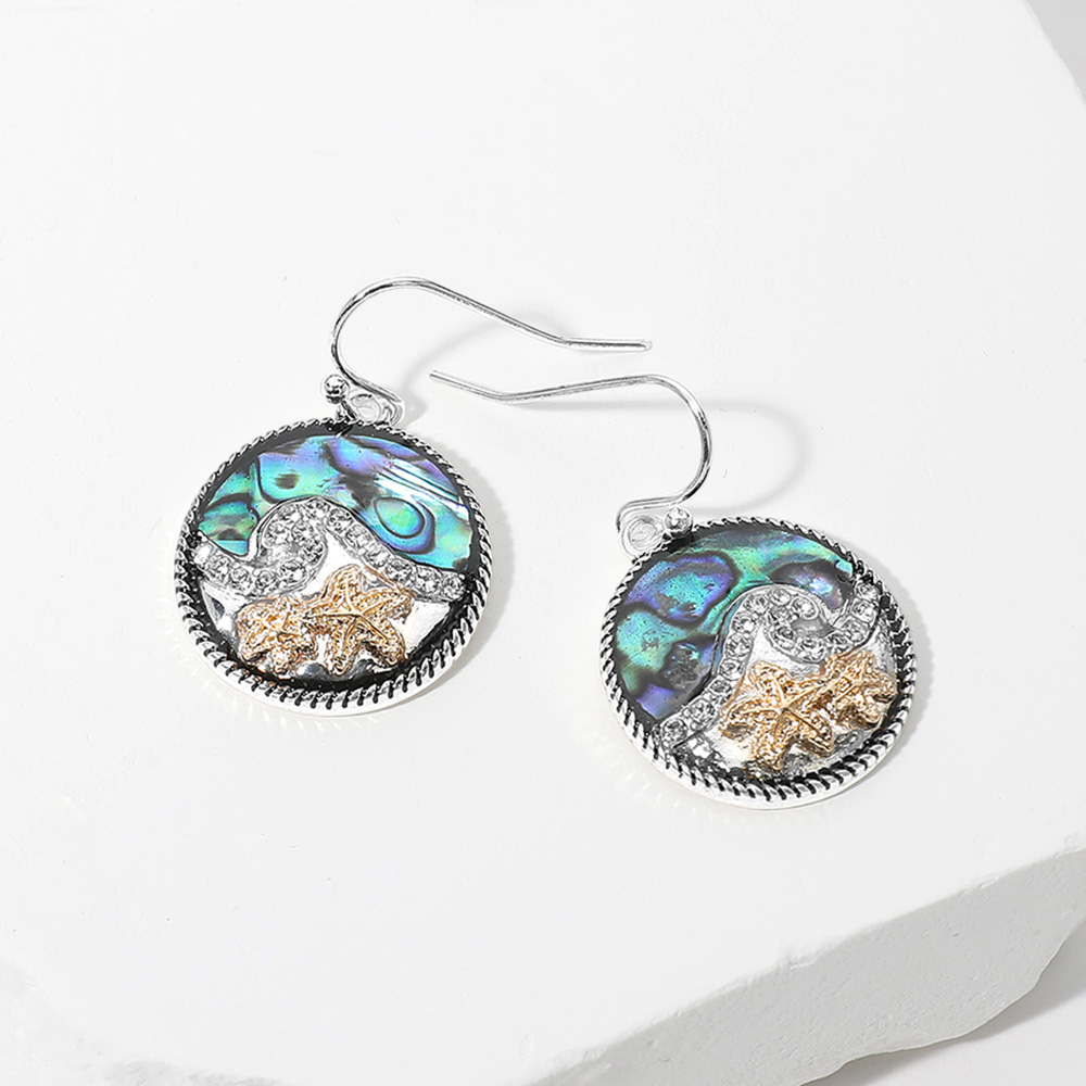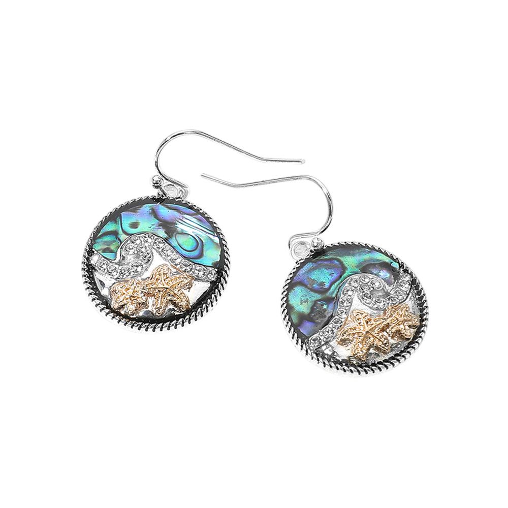 Two Tone Starfish Abalone Stone Paved Wave Round Dangle Earrings