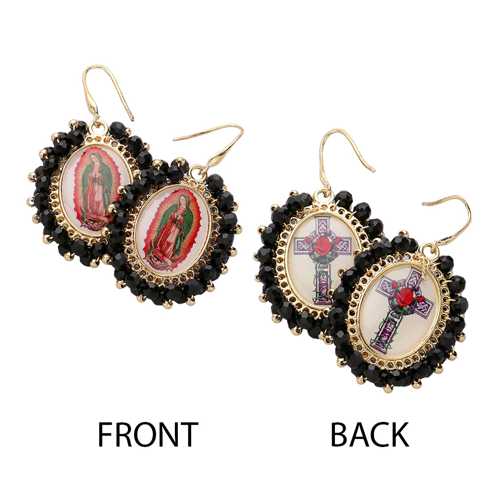 Virgin Mary Cross Printed Faceted Bead Cluster Dangle Earrings