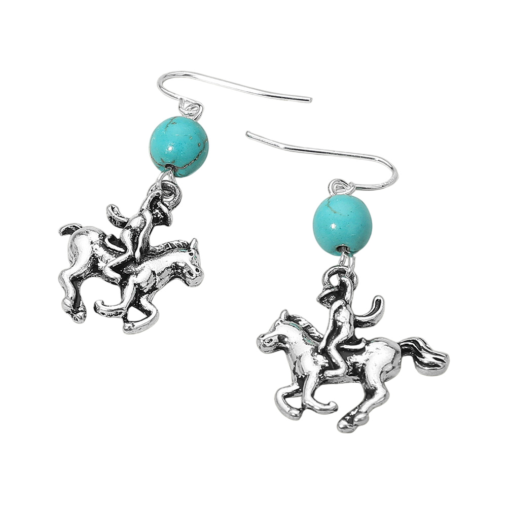 Details • Size : 0.8" X 1.75" • Fish Hook Back • Show off your adventurous style with these western cowboy rider drop earrings. Featuring detailed horse and rider charms paired with round accents, they bring a bold, rustic charm to your look—perfect for adding personality to casual outfits or themed occasions with western flair. • Lead and Nickel Compliant