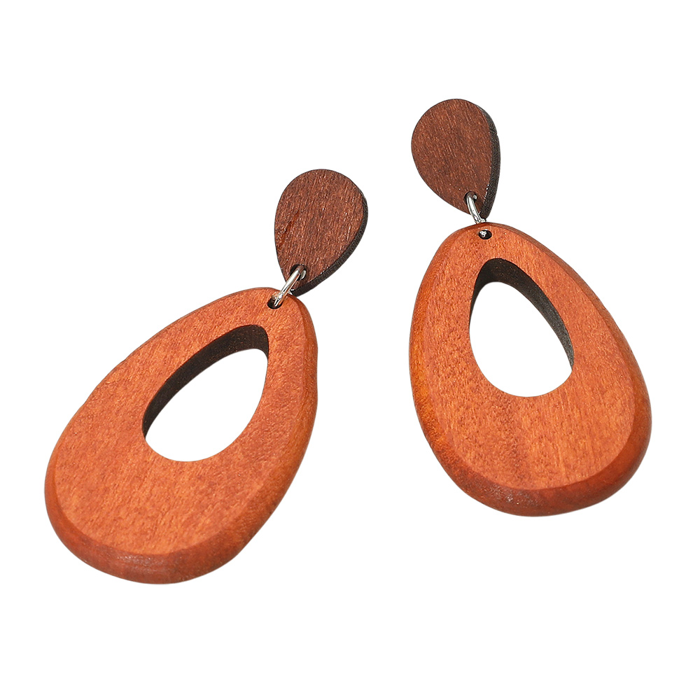 Details • Size : 1.2" X 2.6" • Post Back • Add warm, contemporary style to your look with these lightweight wooden drop earrings featuring smooth, organic cutout shapes. Their minimalist, nature-inspired design offers effortless charm and versatility, making them a perfect accessory for everyday wear or curated modern outfits. • Lead and Nickel Compliant