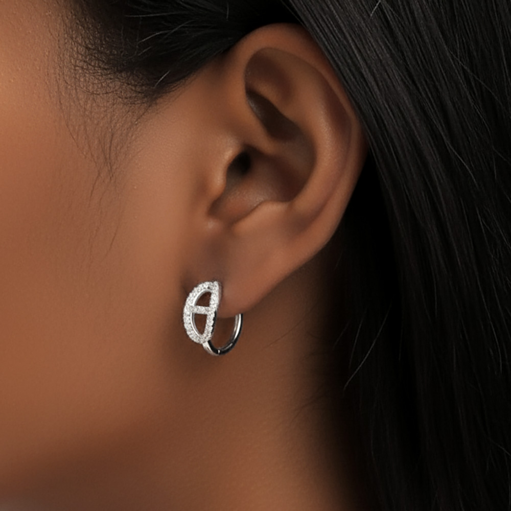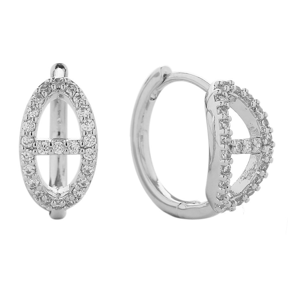 • Stylish oval hoop earrings encrusted with sparkling cubic zirconia in a pavĂ© setting. Featuring a unique cross-bar detail, these earrings combine elegance and modern charm, perfect for dressing up special occasions or adding brilliance to everyday looks.