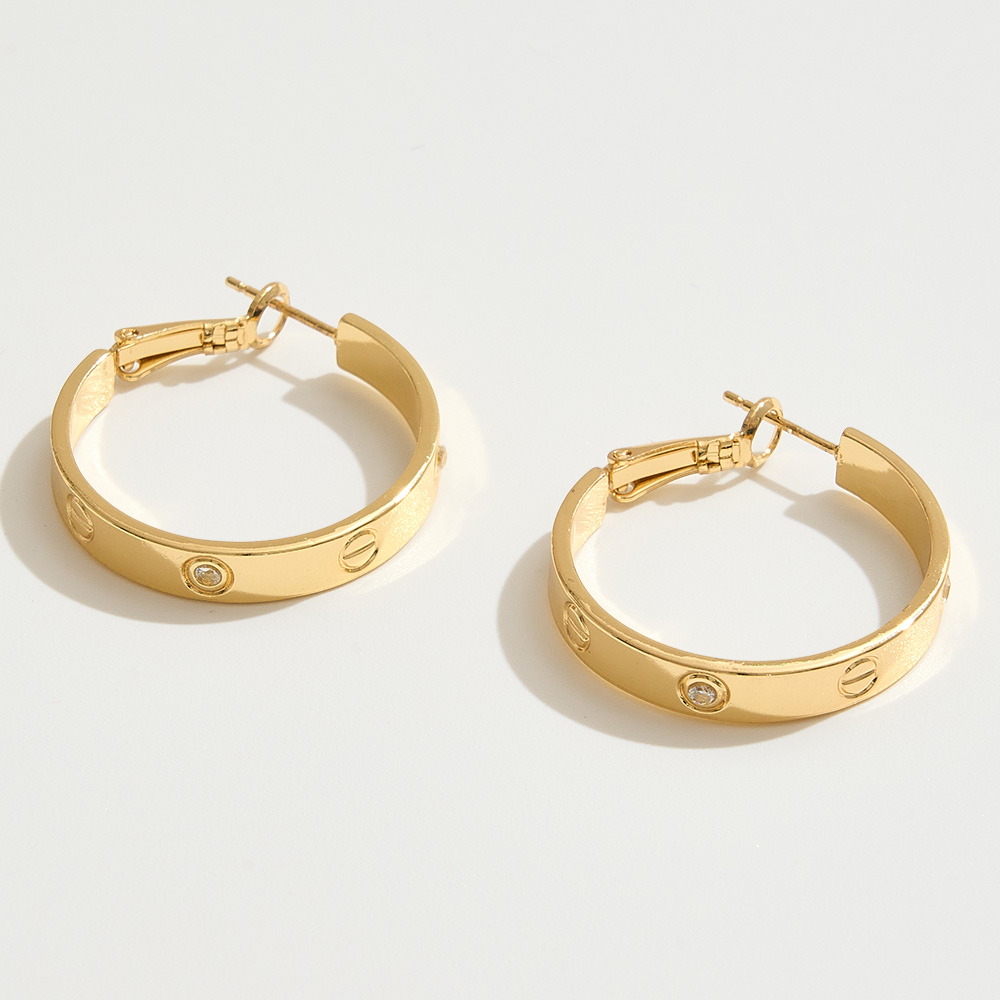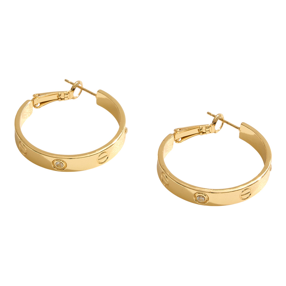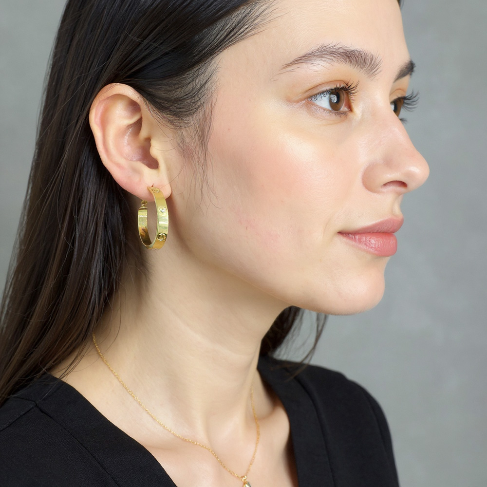 • Sleek and timeless, these hoop earrings feature a polished band engraved with subtle screw-inspired accents and sparkling CZ details. Their versatile design makes them the perfect everyday accessory, adding a modern edge to both casual and dressy outfits.