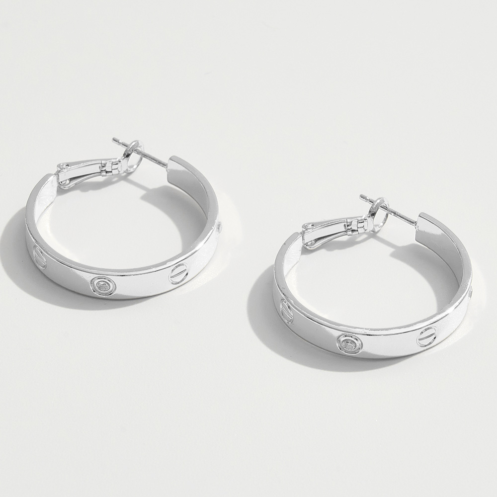 • Sleek and timeless, these hoop earrings feature a polished band engraved with subtle screw-inspired accents and sparkling CZ details. Their versatile design makes them the perfect everyday accessory, adding a modern edge to both casual and dressy outfits.