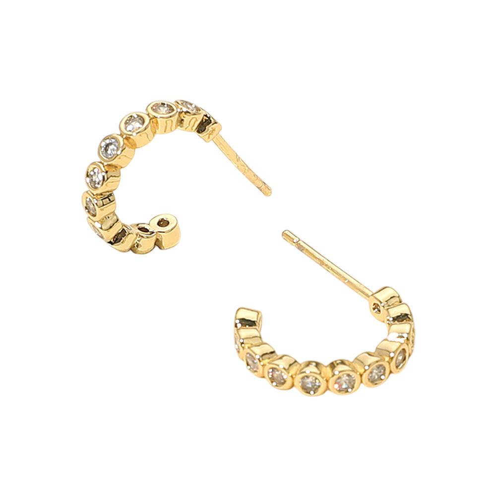 Details • Size : 0.75" X 0.5" X 0.1" • Post Back • Chic half hoop earrings adorned with bezel-set crystals for a refined touch of sparkle. Lightweight and versatile, they blend modern elegance with timeless style. Perfect for everyday wear or dressing up special occasions, these hoops are a must-have accessory to elevate both casual and formal looks. • Brass • CZ Cubic Zirconia • Gold Dipped • Hypoallergenic • Lead and Nickel Compliant • Made In Korea