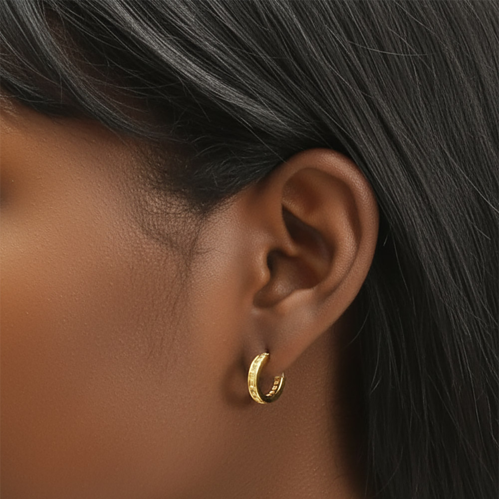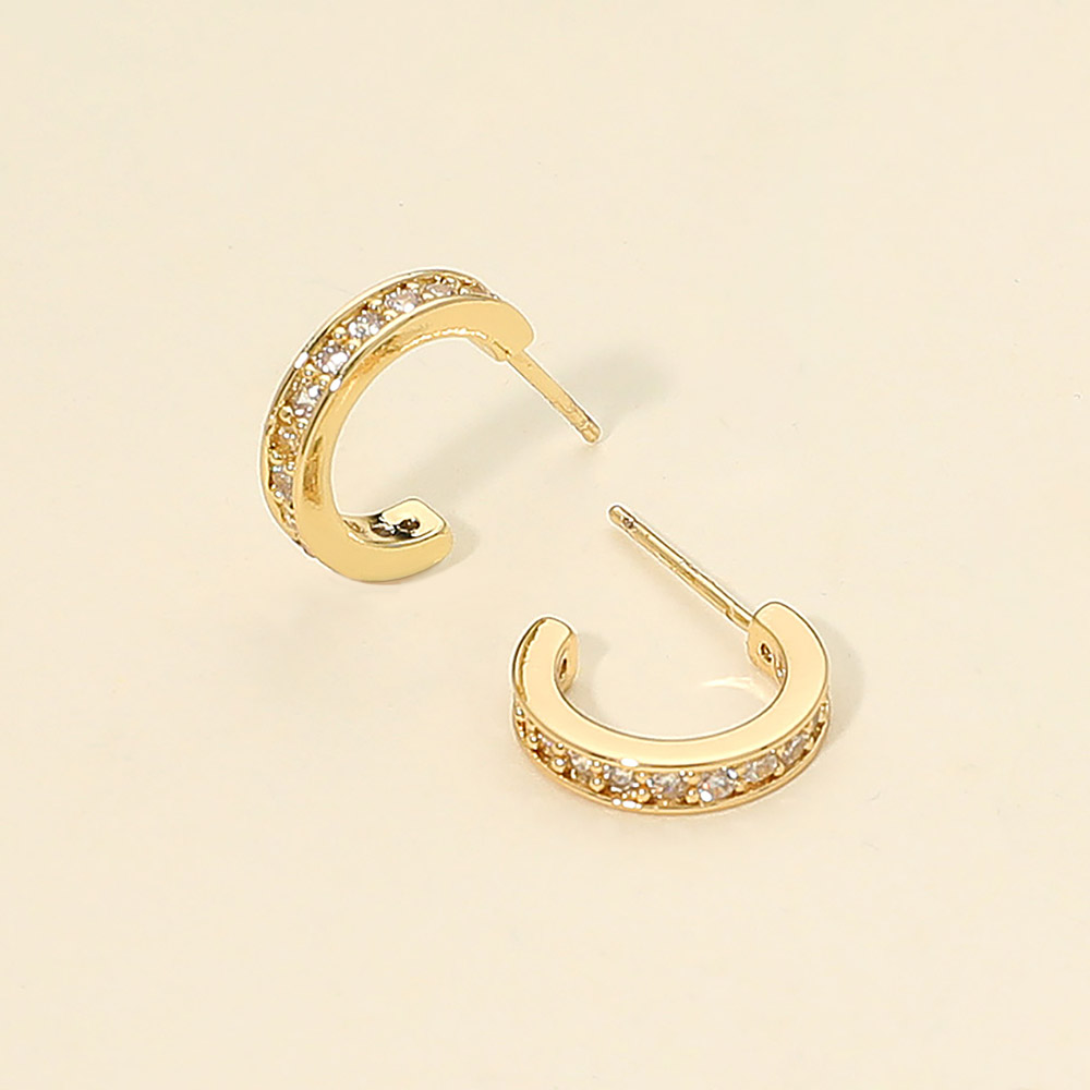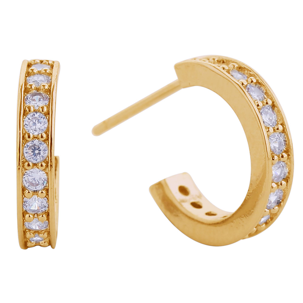 Details • Size : 0.5" X 0.5" • Post Back • Chic half hoop earrings designed with a sleek silhouette and shimmering pave detailing. A versatile accessory that adds a touch of sparkle to casual outfits while elevating dressy looks with timeless sophistication. • Brass • CZ Cubic Zirconia • Gold Dipped • Hypoallergenic • Lead and Nickel Compliant • Made In Korea