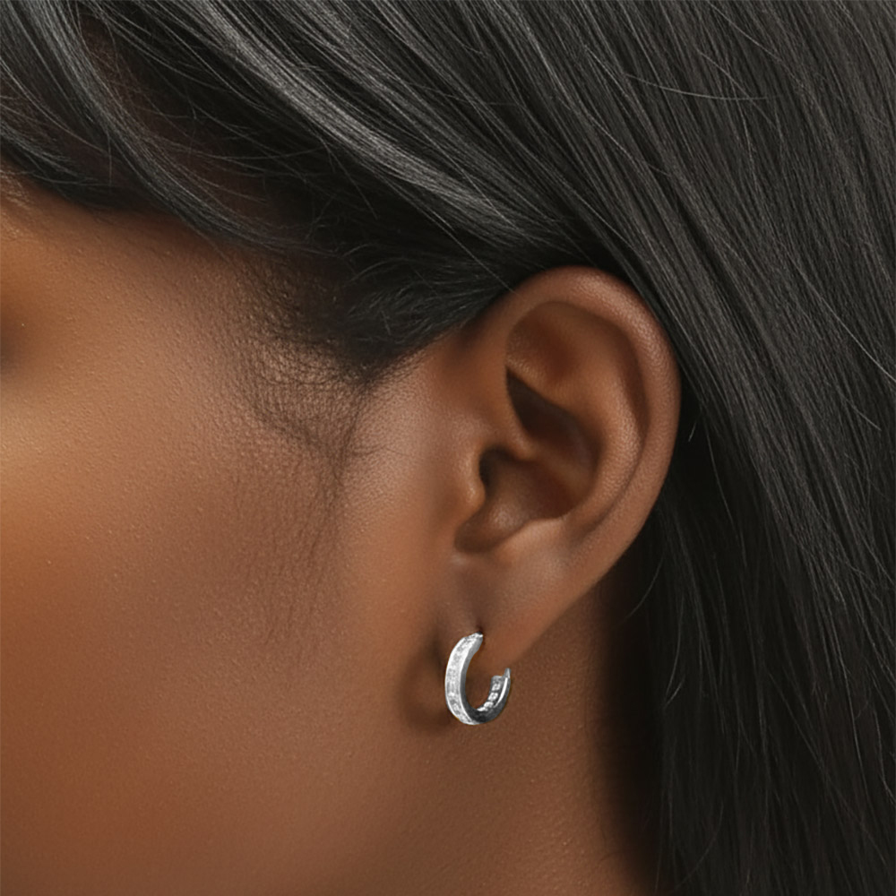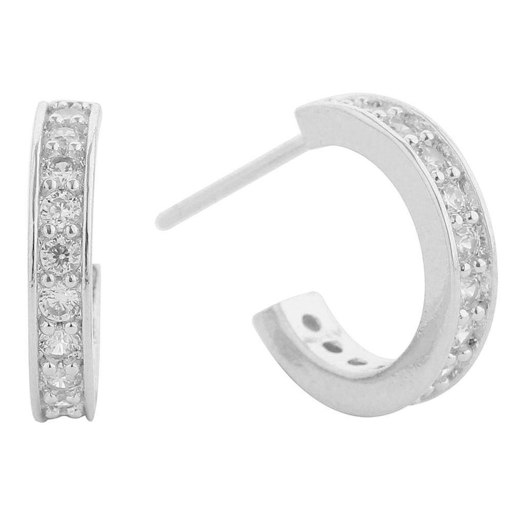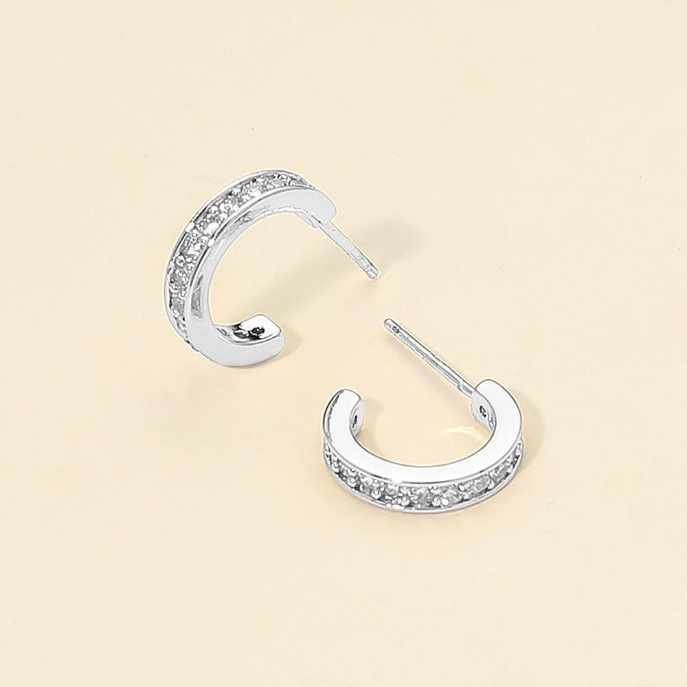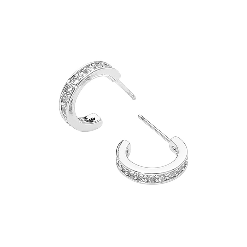 Details • Size : 0.5" X 0.5" • Post Back • Chic half hoop earrings designed with a sleek silhouette and shimmering pave detailing. A versatile accessory that adds a touch of sparkle to casual outfits while elevating dressy looks with timeless sophistication. • Brass • CZ Cubic Zirconia • Gold Dipped • Hypoallergenic • Lead and Nickel Compliant • Made In Korea