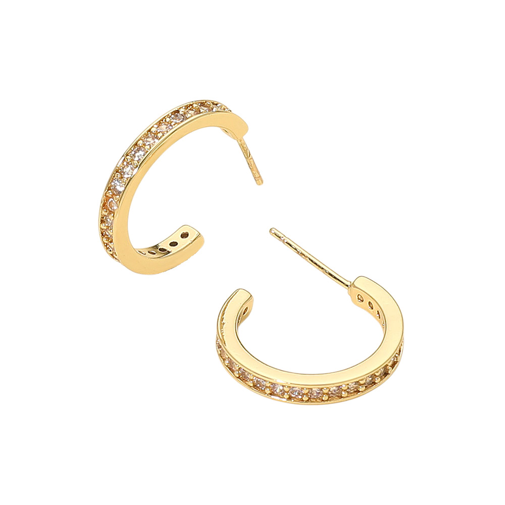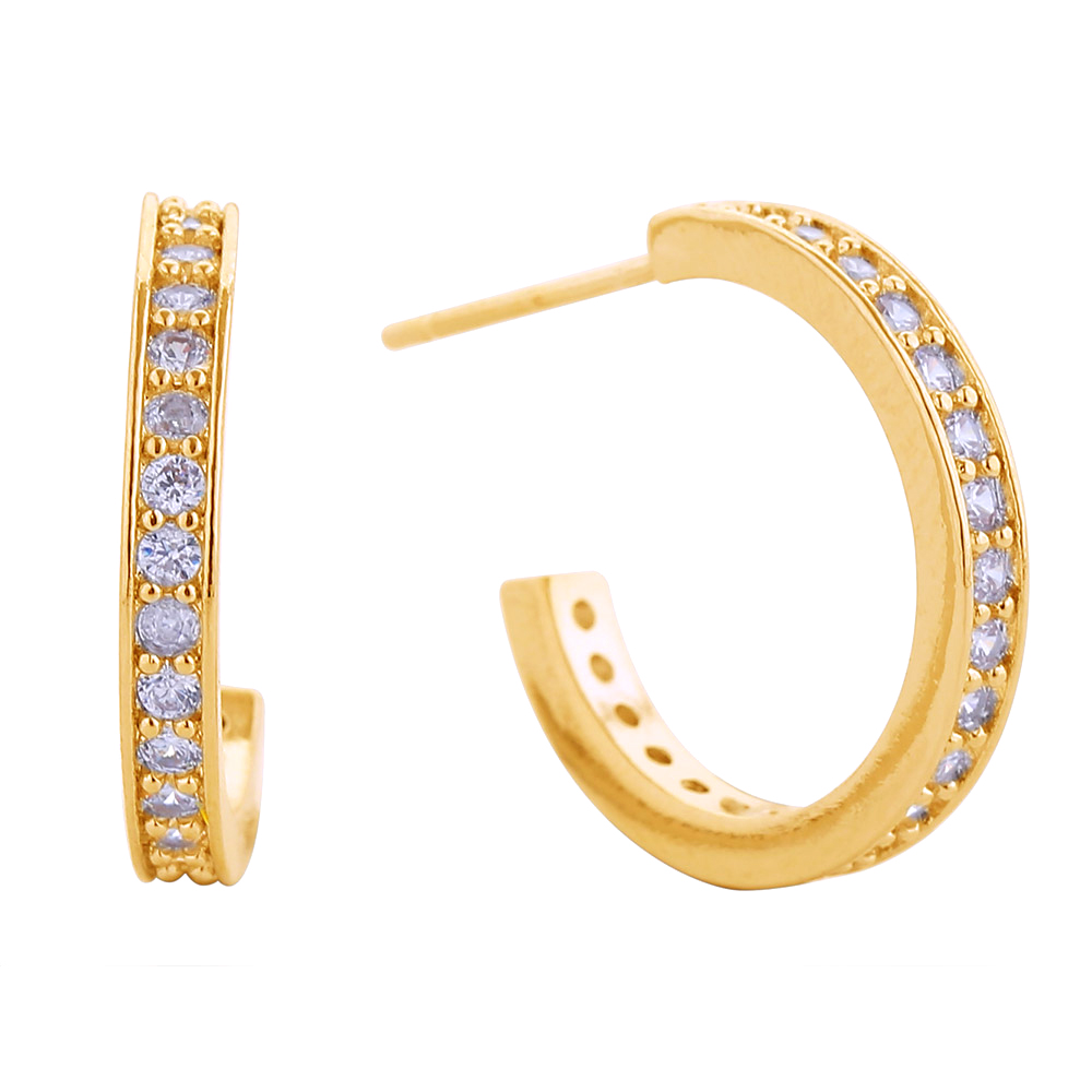 Details • Size : 0.75" X 0.75" • Post Back • Timeless half hoop earrings adorned with delicate shimmering accents. Their elegant curve and refined sparkle make them the perfect choice for enhancing everyday outfits or adding sophistication to evening looks. • Brass • CZ Cubic Zirconia • Gold Dipped • Hypoallergenic • Lead and Nickel Compliant • Made In Korea