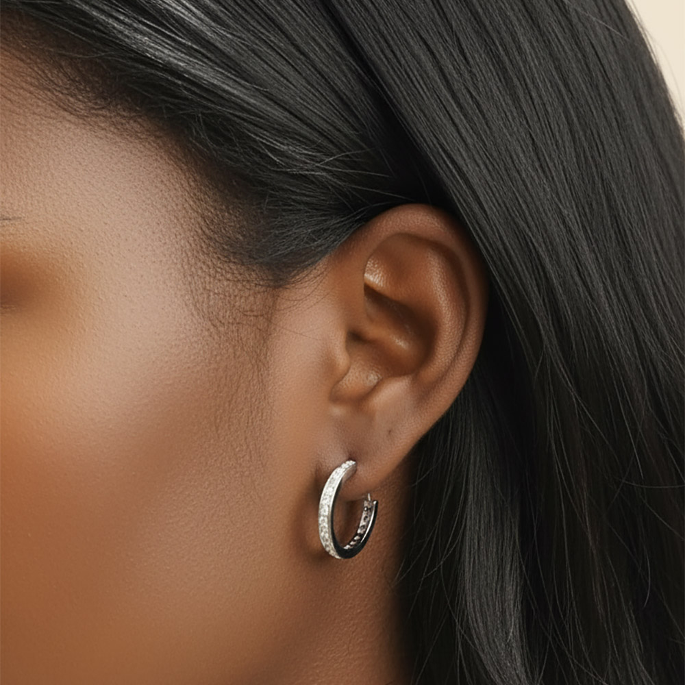 Details • Size : 0.75" X 0.75" • Post Back • Timeless half hoop earrings adorned with delicate shimmering accents. Their elegant curve and refined sparkle make them the perfect choice for enhancing everyday outfits or adding sophistication to evening looks. • Brass • CZ Cubic Zirconia • Gold Dipped • Hypoallergenic • Lead and Nickel Compliant • Made In Korea