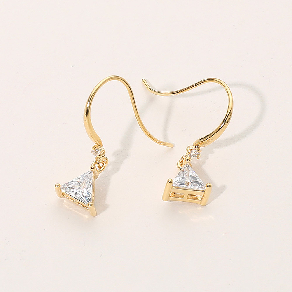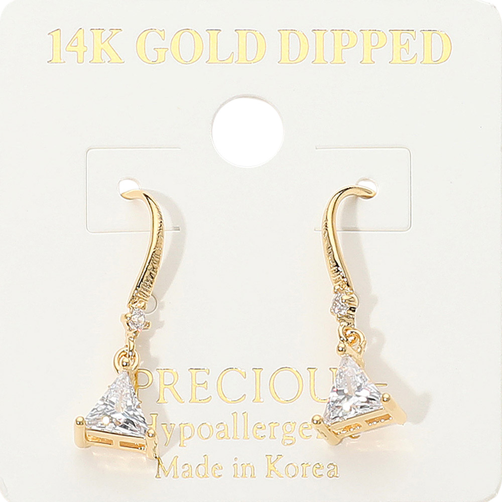 Details • Size : 0.3" X 1" • Fish Hook Back • Add refined sparkle to your look with these cz triangle drop earrings featuring a sleek geometric silhouette and dangling accents for subtle movement. Lightweight and comfortable for everyday wear or special occasions, they deliver modern elegance that complements casual outfits or elevated ensembles with effortless style. • Hypoallergenic • Made In Korea • Gold Dipped • CZ Cubic Zirconia