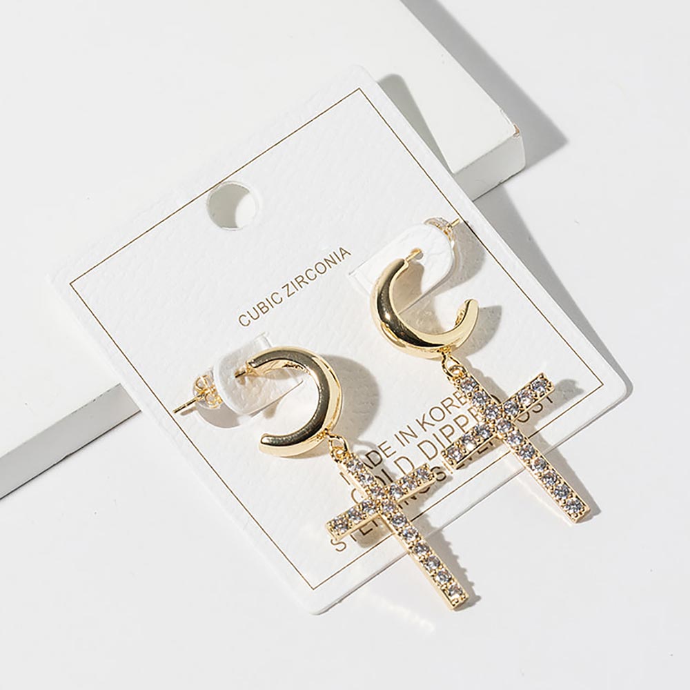 • Elegant cross drop hoop earrings featuring a sleek curved hoop paired with a pavĂ©-style cross charm. Designed for everyday wear or statement styling, this timeless silhouette blends modern edge with classic symbolism, making it a strong choice for trend-focused boutiques and gift-ready jewelry collections.