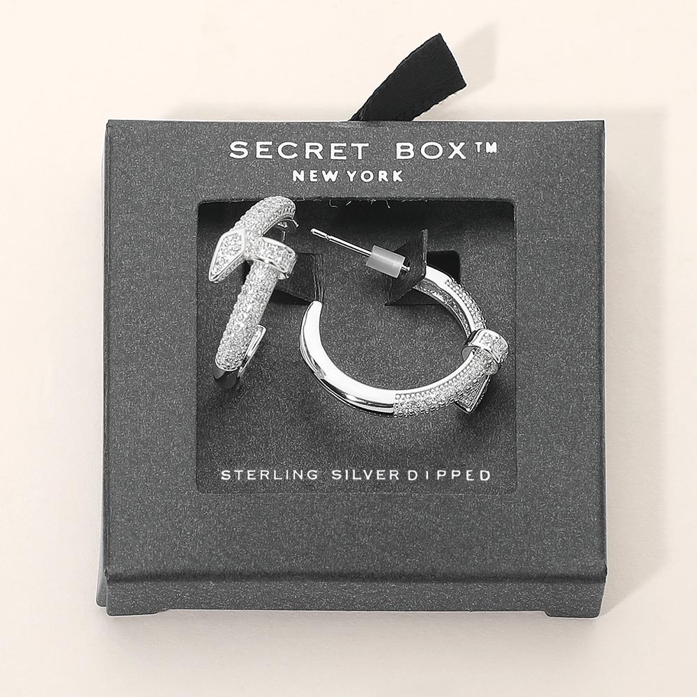 Details • Size : 0.9" X 0.8" X 0.3" • Post Back • Chic hoop earrings featuring a refined nail shape element and shimmering pave-style detailing. Their modern shape and eye-catching sparkle make them a perfect accessory for elevating everyday outfits or adding polish to special-occasion looks. • Sterling Silver Dipped