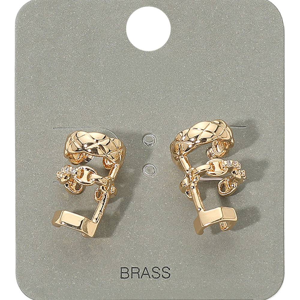 Details • Size : 0.5" X 0.75" • Post Back • Modern ear cuff earrings designed with a triple hoop stacked style and shimmering crystal accents. A stylish accessory to elevate any outfit, perfect for casual wear, parties, or evening occasions. • Brass • Lead and Nickel Compliant