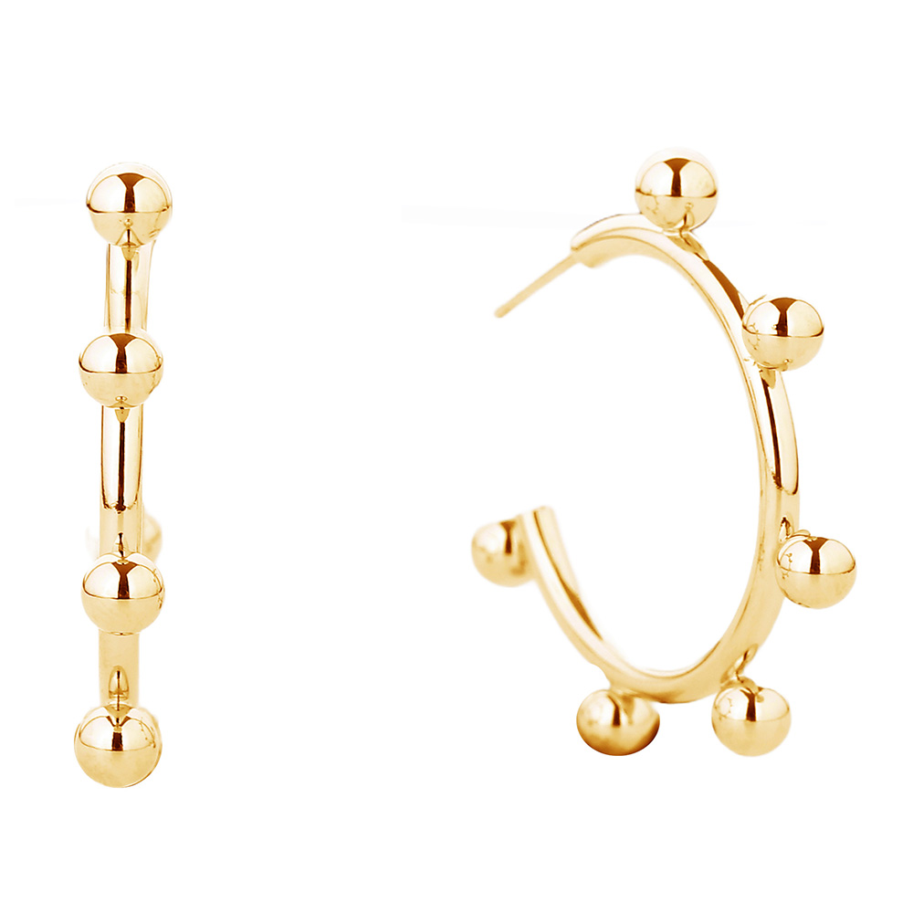 Details • Size : 1.25" X 1" • Post Back • Striking hoop earrings designed with polished ball details along the curve for a bold and contemporary edge. Perfect for elevating everyday outfits or making a stylish statement, these hoops balance modern geometry with timeless sophistication. • Brass • Gold Dipped • Hypoallergenic • Lead and Nickel Compliant • Made In Korea
