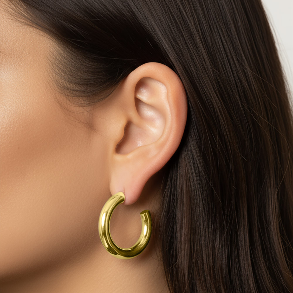 Details • Size : 1.2" X 1.2" • Post Back • Refined and versatile, these small open hoop earrings add a touch of modern polish to any outfit. Their sleek design offers timeless appeal, making them a perfect everyday essential that transitions seamlessly from work to evening wear. • Brass • Gold Dipped • Hypoallergenic • Lead and Nickel Compliant • Made In Korea