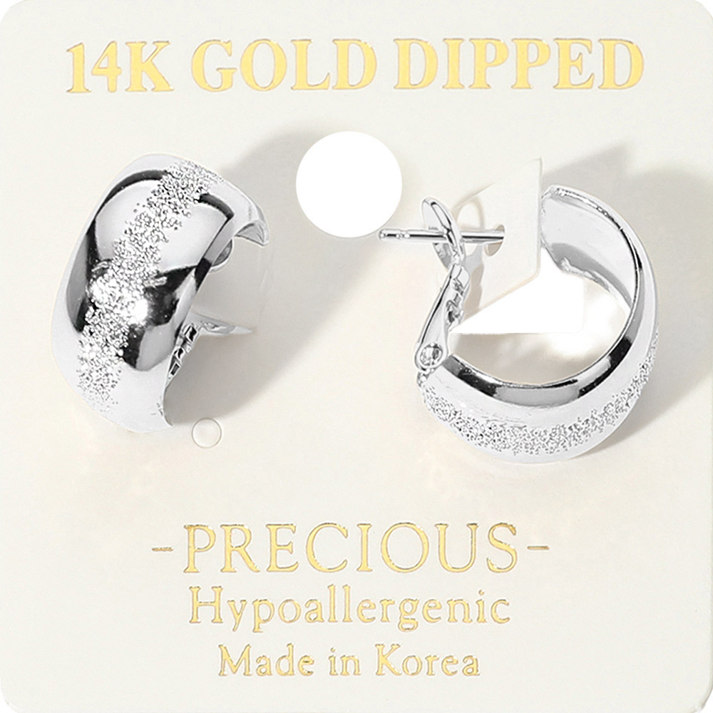 • These elegant hoop earrings feature a bold curved silhouette with a central textured shimmer detail for added sparkle. Hypoallergenic and gold dipped, they blend comfort and sophistication—perfect for adding polish to both day and evening looks.
