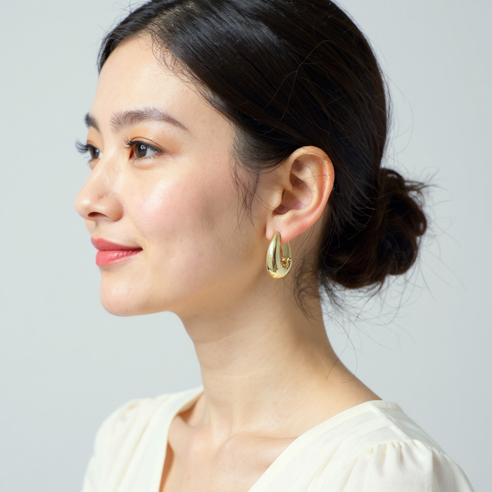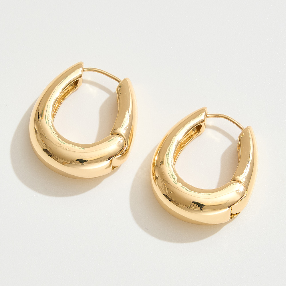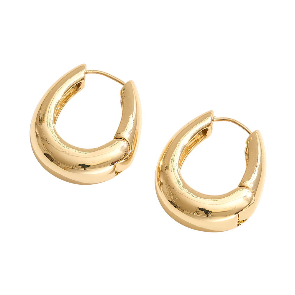 • These thick tapered hoop earrings feature a bold rounded shape that narrows at the top for a refined look. Modern yet timeless, they’re designed to elevate everyday outfits while adding a statement edge to eveningwear, making them a versatile must-have accessory.