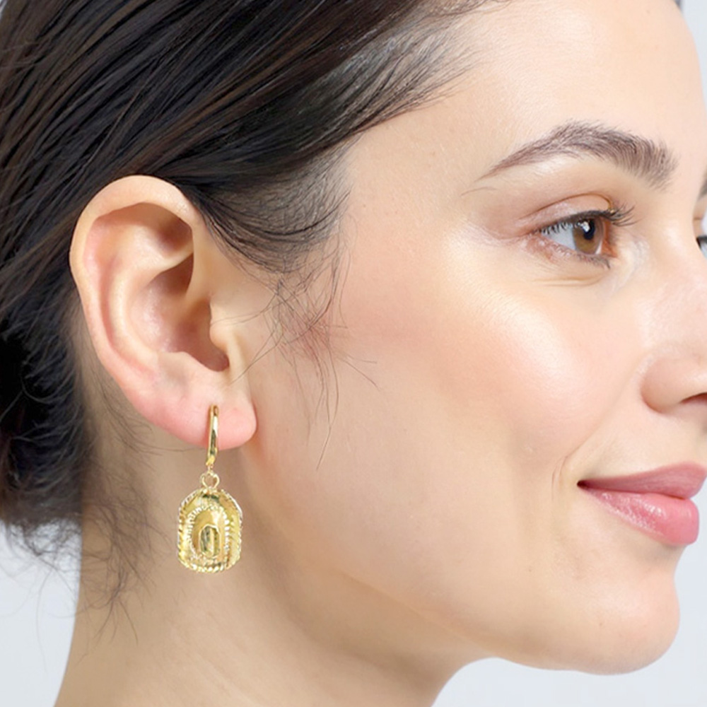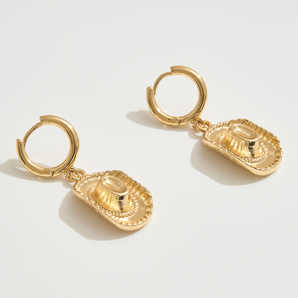 Details • Size : 0.5" X 1.3" • Huggie Back • These cowboy hat dangle hoop earrings bring playful western charm to your jewelry collection. Featuring detailed hat pendants that swing from sleek hoops, they’re perfect for adding a fun, standout accent to casual outfits, festivals, or themed events. • Brass • Gold Dipped • Hypoallergenic • Lead and Nickel Compliant • Made In Korea