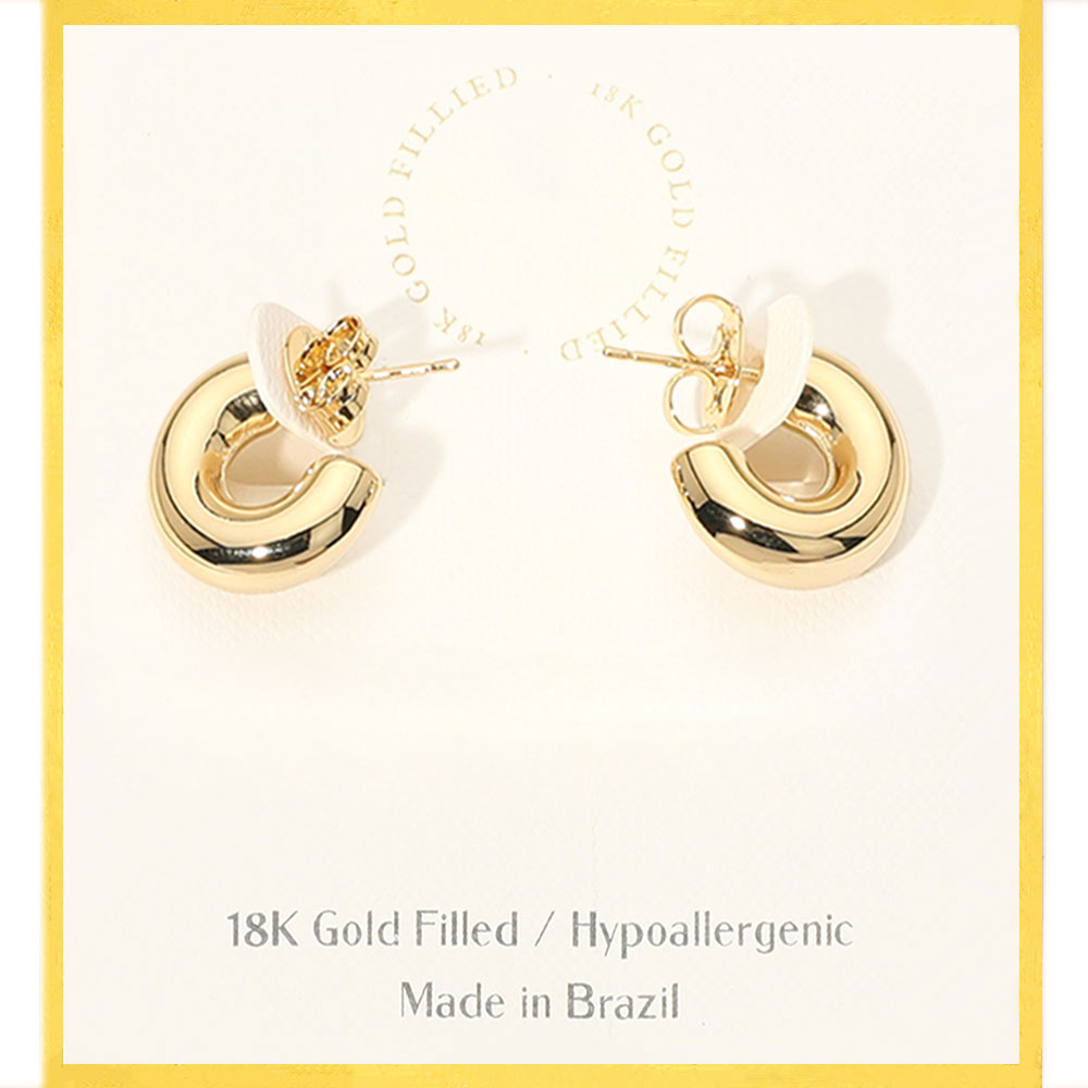 Details • Size : 0.8" X 0.75" • Post Back • Modern chunky hoop stud earrings designed with a smooth, rounded silhouette that adds effortless polish to any look. A versatile accessory that transitions seamlessly from everyday wear to evening styling, offering a bold yet timeless statement for curated jewelry collections. • Gold Filled • Hypoallergenic • Made In Brazil
