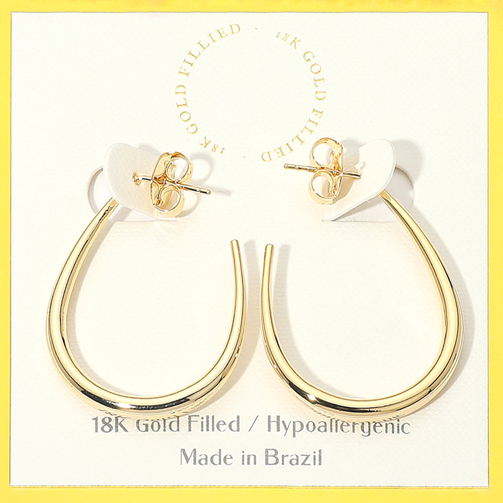 Details • Size : 1.2" X 1.5" • Post Back • Water Resistant and Tarnish Free • These teardrop hoop earrings feature a sleek and modern silhouette that blends elegance with everyday wearability. Lightweight and comfortable, their unique shape adds a touch of sophistication, making them perfect for pairing with casual outfits or evening looks. • Gold Filled • Hypoallergenic • Lead and Nickel Compliant • Made In Brazil