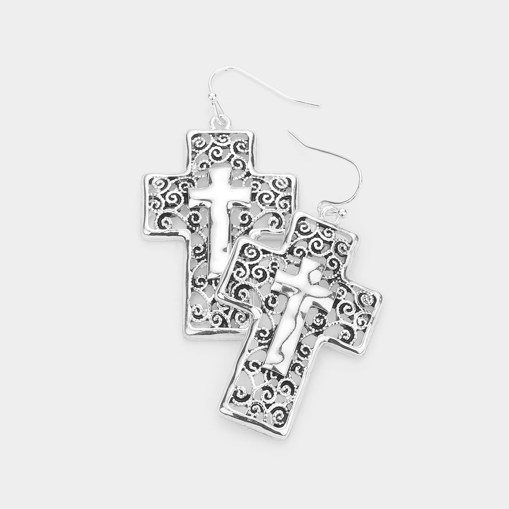 Two Tone Twisted Knot Metal Cross Dangle Earrings