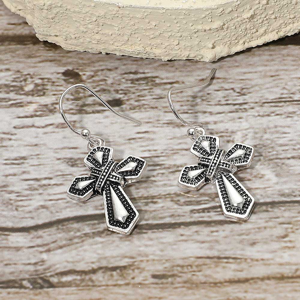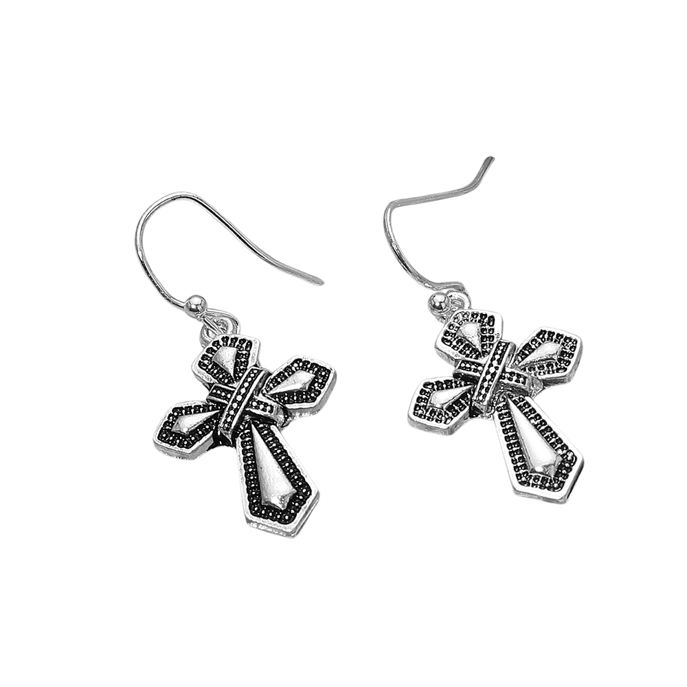 Details • Size : 0.6" X 1.3" • Fish Hook Back • Complete your look with these antique-style cross drop earrings featuring intricate vintage detailing. Lightweight and versatile, they bring a touch of faith-inspired elegance and timeless charm, perfect for daily wear or adding meaningful style to special occasion outfits. • Lead and Nickel Compliant