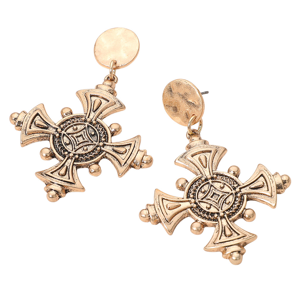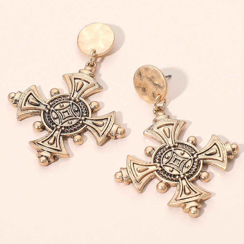 Details • Size : 1.6" X 2.4" • Post Back • Make a bold statement with these Antique Cross Drop Earrings. Designed with intricate engraved detailing and a striking symmetrical shape, these earrings channel vintage artistry and refined elegance—perfect for adding a touch of historical charm to any modern look. • Lead and Nickel Compliant