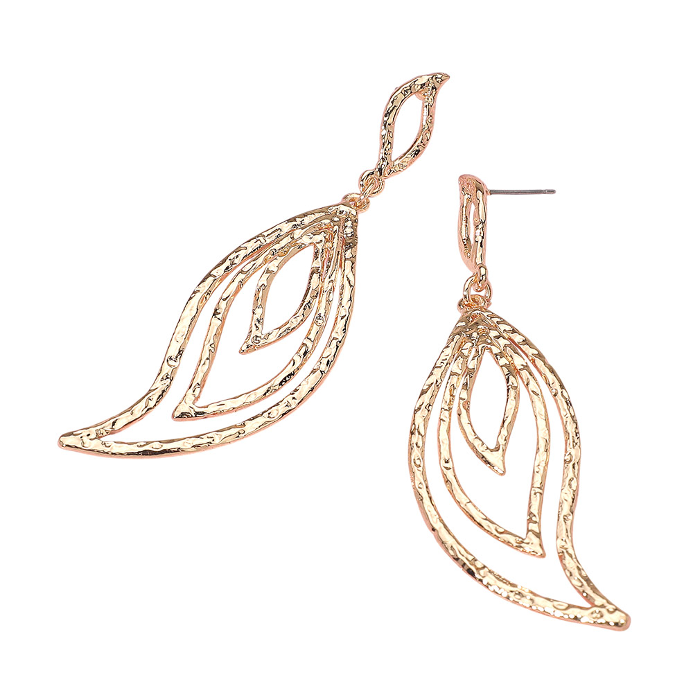 Details • Size : 1" X 3.25" • Post Back • Elegant drop earrings featuring a layered open leaf design with a hammered texture for added dimension. Lightweight and stylish, these earrings bring a modern organic touch to any outfit, perfect for both casual looks and evening occasions. • Lead and Nickel Compliant
