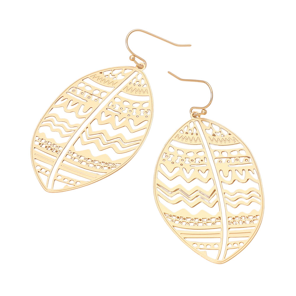 Details • Size : 1.25" X 2.5" • Fish Hook Back • Make a bold statement with these tribal pattern leaf cutout earrings. Featuring intricate geometric detailing and a lightweight design, they bring an artistic and contemporary edge to your style. Perfect for expressing individuality and adding flair to any casual or chic outfit. • Brass • Lead and Nickel Compliant