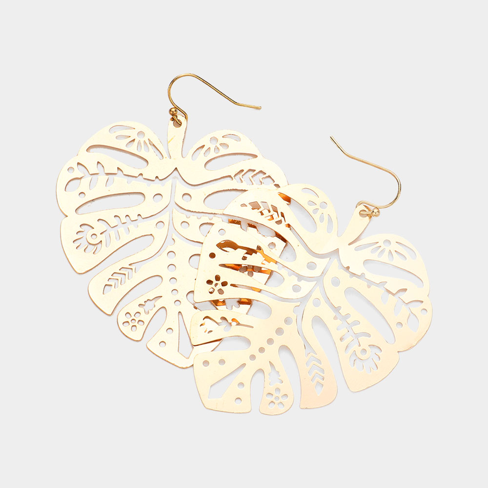 Brass Metal Tropical Leaf Filigree Teardrop Dangle Earrings