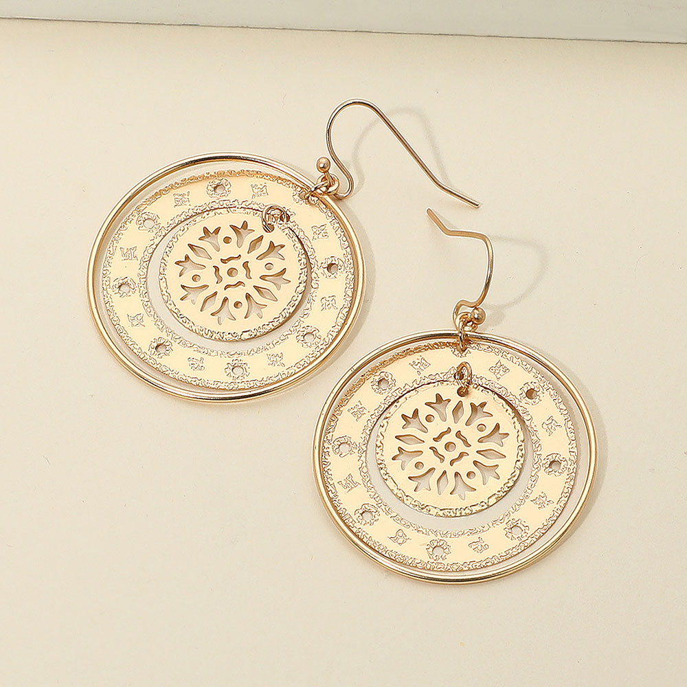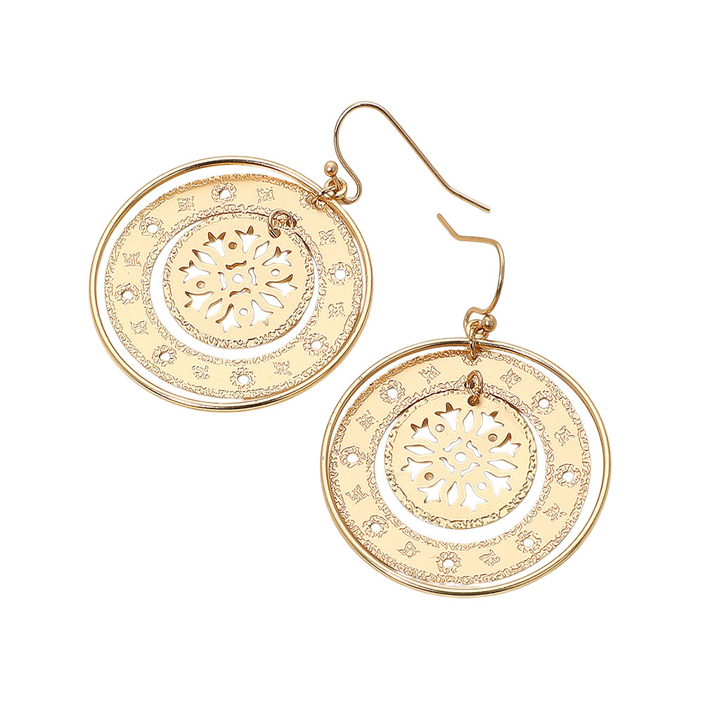Details • Size : 1.5" X 2" • Fish Hook Back • Chic medallion drop earrings featuring an intricate cutout design with layered circular accents. Lightweight and versatile, these earrings bring a touch of detail and shine to everyday and occasion wear. • Lead and Nickel Compliant