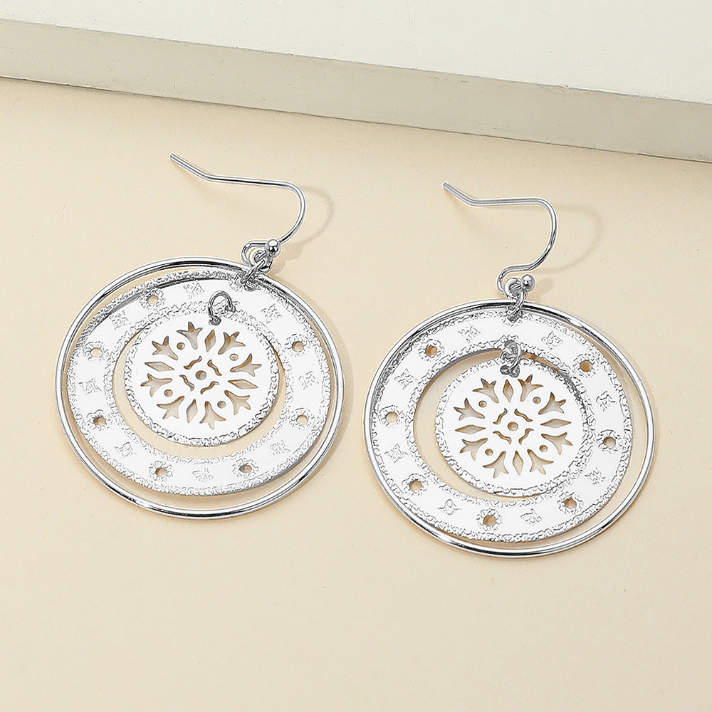 Details • Size : 1.5" X 2" • Fish Hook Back • Chic medallion drop earrings featuring an intricate cutout design with layered circular accents. Lightweight and versatile, these earrings bring a touch of detail and shine to everyday and occasion wear. • Lead and Nickel Compliant