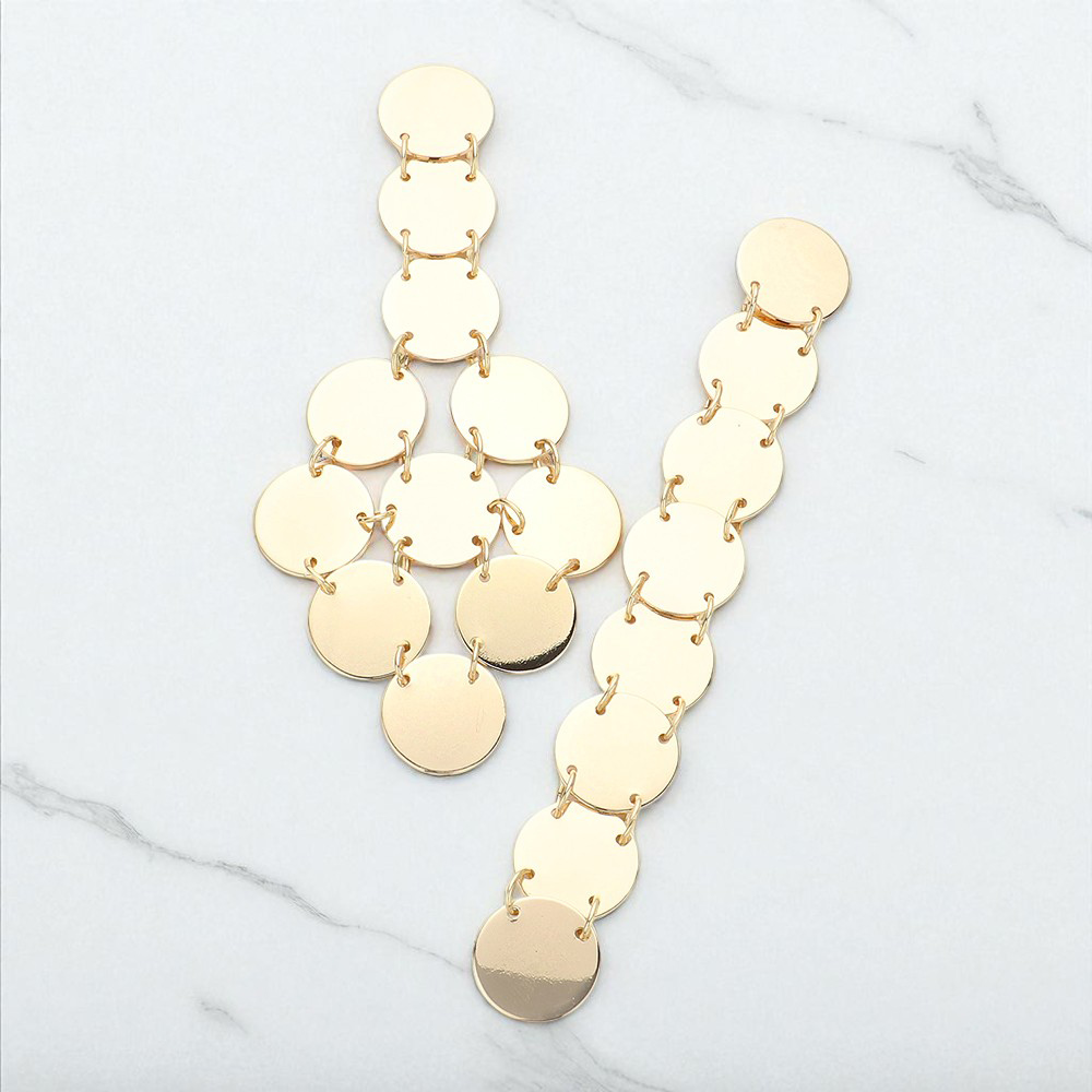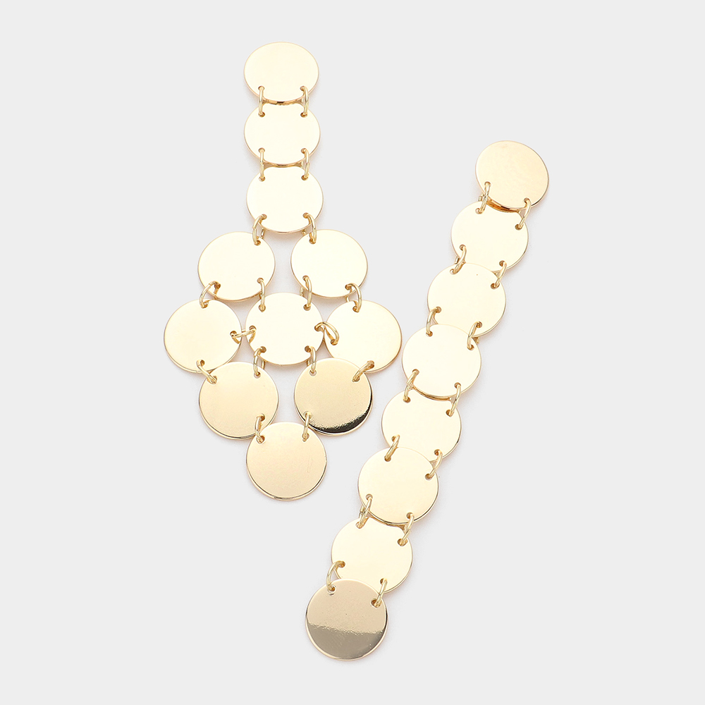 • These geometric disc statement drop earrings feature cascading polished discs that create bold movement and shine. A modern yet versatile design, perfect for elevating both casual and dressy looks. Lightweight and eye-catching, they add a contemporary edge to any outfit.
