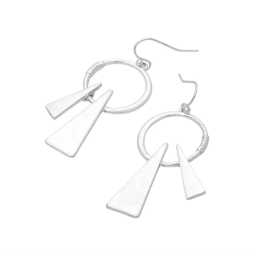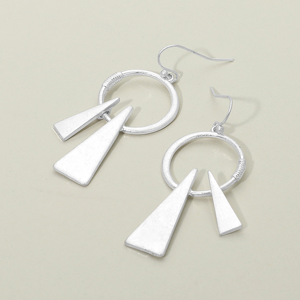 Details • Size : 0.8" X 2" • Fish Hook Back • Contemporary drop earrings featuring sleek circle bases with bold triangle accents. Lightweight and versatile, these geometric earrings add a modern, artistic touch to both casual and dressy looks, making them a standout accessory for everyday style. • Lead and Nickel Compliant