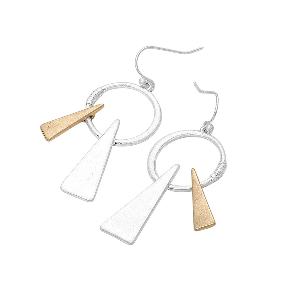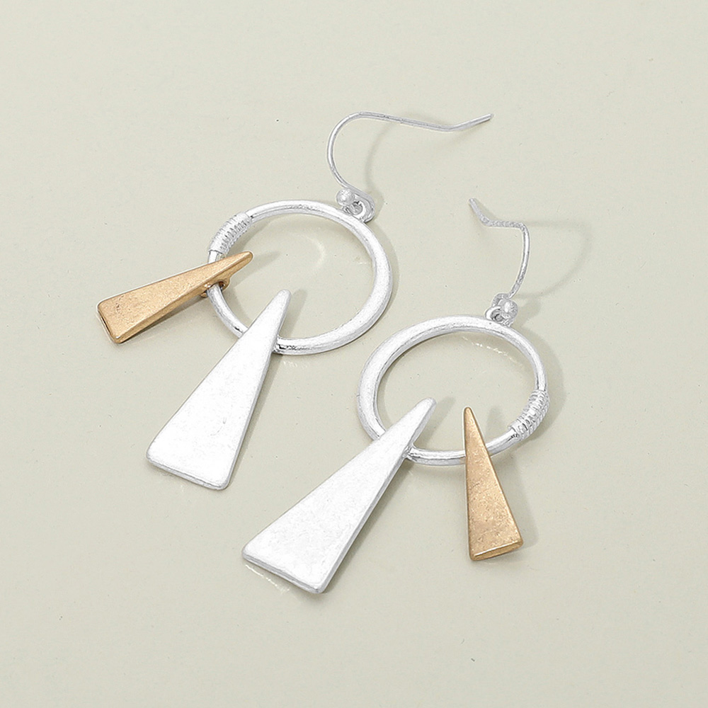 Details • Size : 0.8" X 2" • Fish Hook Back • Contemporary drop earrings featuring sleek circle bases with bold triangle accents. Lightweight and versatile, these geometric earrings add a modern, artistic touch to both casual and dressy looks, making them a standout accessory for everyday style. • Lead and Nickel Compliant