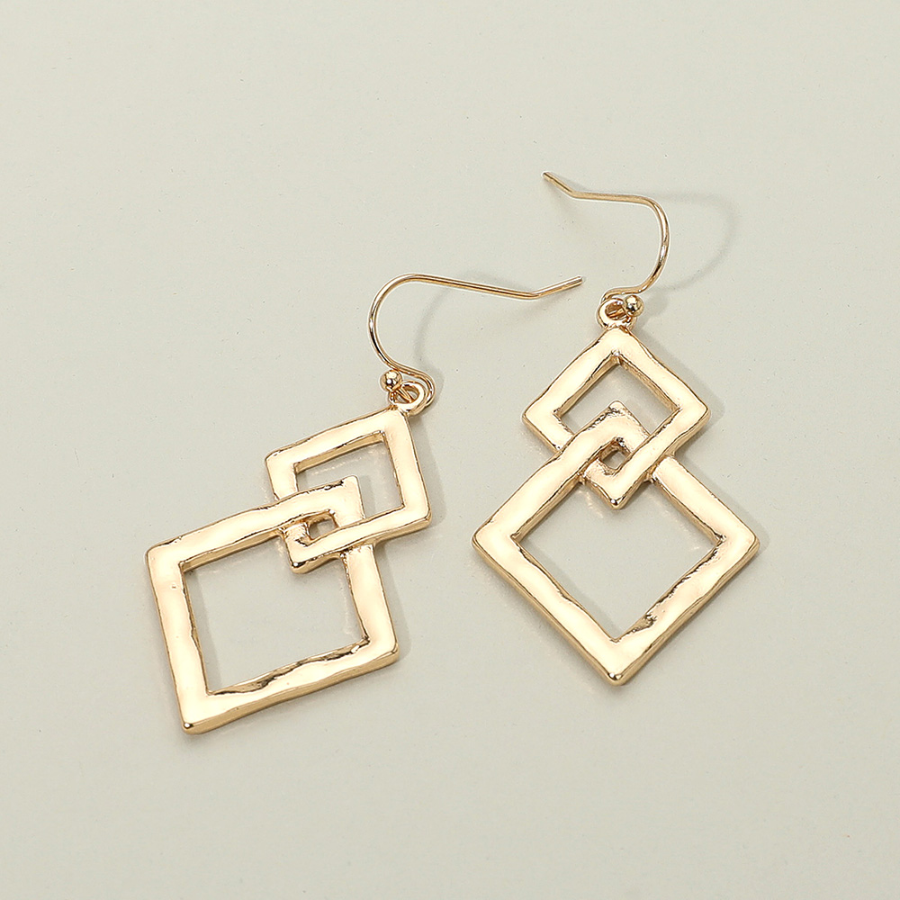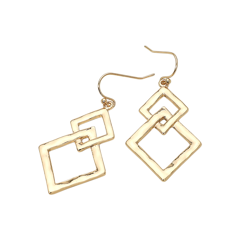 Details • Size : 1" X 2" • Fish Hook Back • Bold and stylish, these geometric drop earrings feature interlinked open square shapes for a sleek, contemporary look. Lightweight and eye-catching, they’re the perfect accessory to elevate casual or dressy outfits with modern flair. • Lead and Nickel Compliant