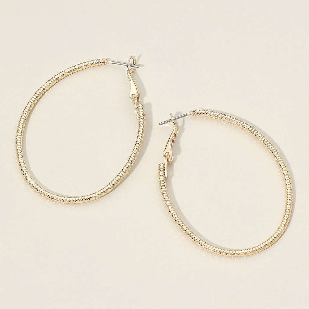 Details • Size : 1.5" X 2" • Omega Back • Elegant slim hoop earrings featuring a refined textured finish and a lightweight silhouette for comfortable everyday wear. A versatile accessory that adds modern polish to casual outfits or enhances evening looks with a clean, minimal style. • Lead and Nickel Compliant • Gold Dipped