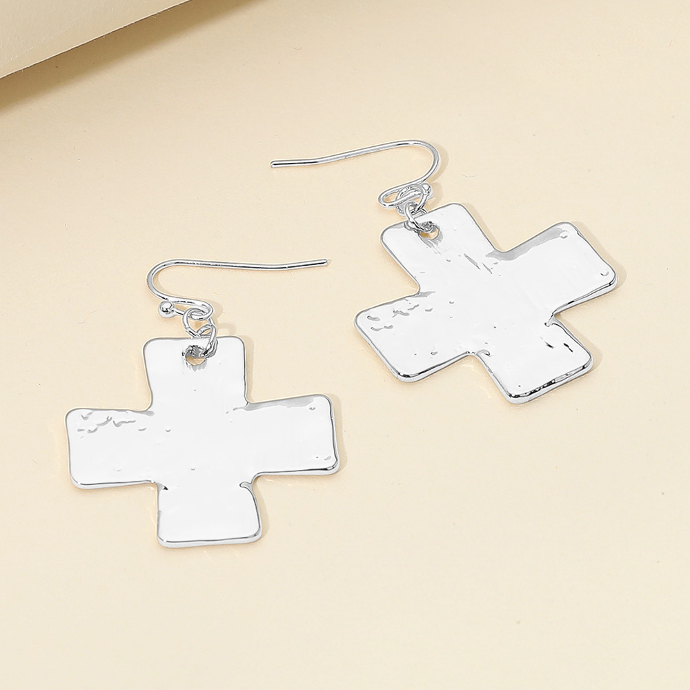 • These hammered cross dangle earrings feature a sleek geometric silhouette with a subtly textured surface for a modern yet artisanal touch. Lightweight and stylish, they bring effortless sophistication to any outfit, perfect for elevating both everyday wear and evening looks.