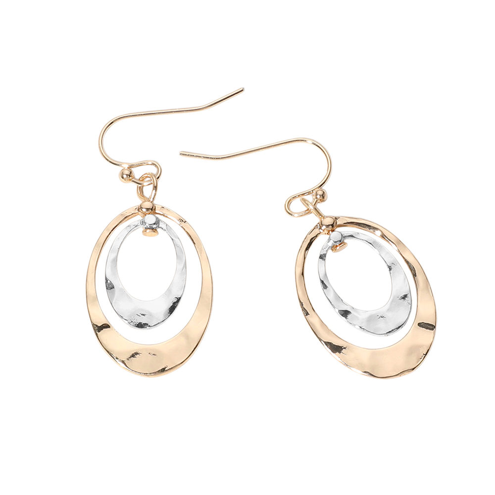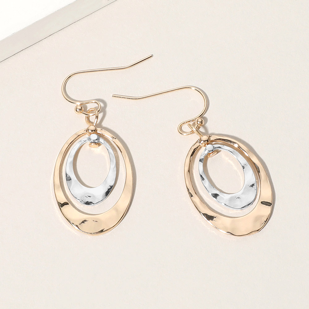Hammered Metal Double Open Oval Layered Dangle Earrings