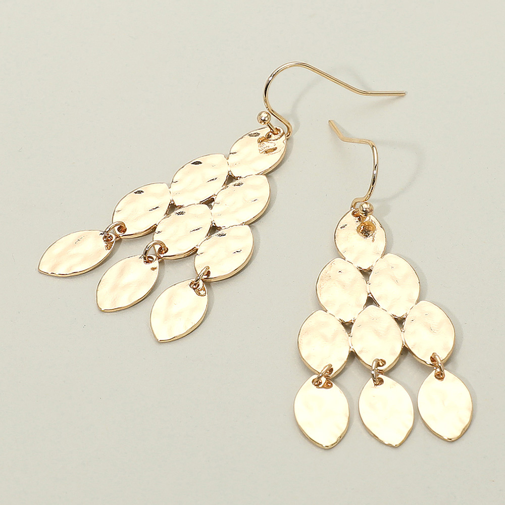 • Graceful tiered metal plate drop earrings designed with cascading layers for a flowing effect. Perfect for both casual and formal looks, these earrings add a touch of sophistication and movement to any outfit.
