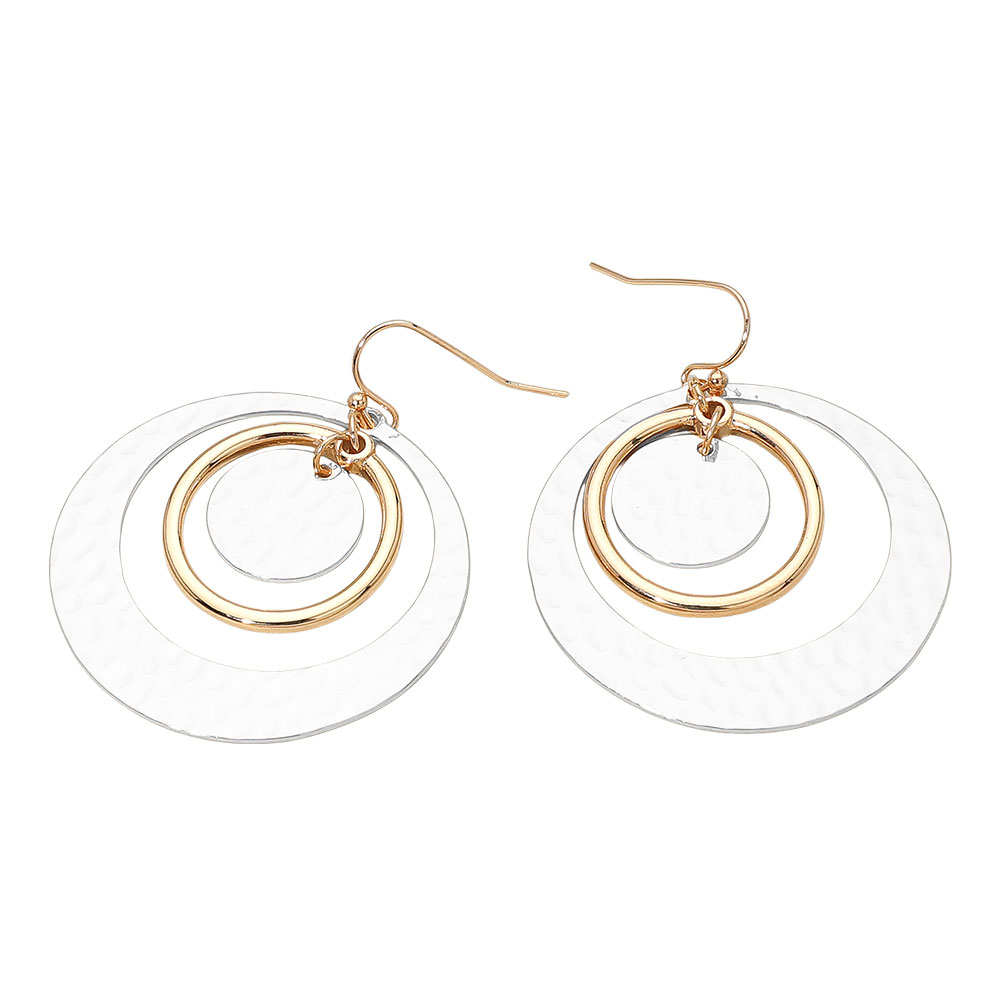 • Add a modern touch to your look with these textured triple circle dangle earrings. Featuring layered open rings with a lightly hammered finish, they catch the light beautifully for an elegant yet contemporary style. Perfect for elevating both casual and dressy ensembles.