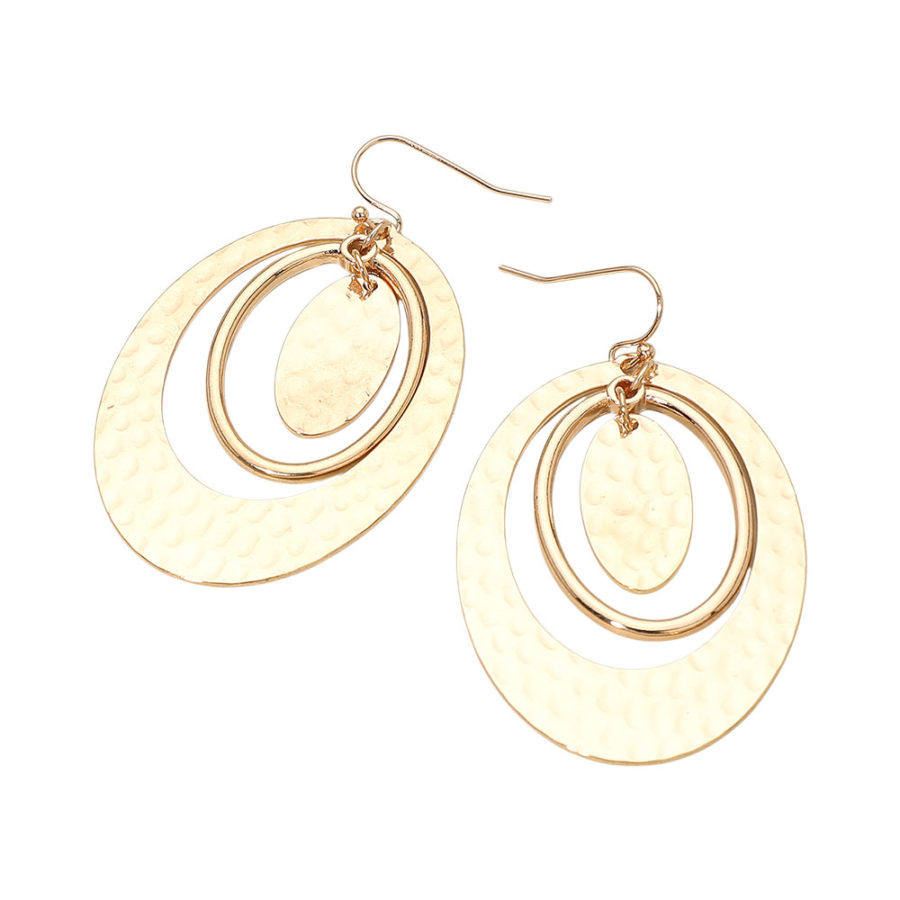 Details • Size : 1.4" X 2.25" • Fish Hook Back • Elevate your accessory game with these textured oval layered dangle earrings. Featuring interlocking open ovals with a subtle hammered finish, they blend modern sophistication with timeless elegance. Perfect for adding movement and shine to both casual and dressy looks. • Lead and Nickel Compliant