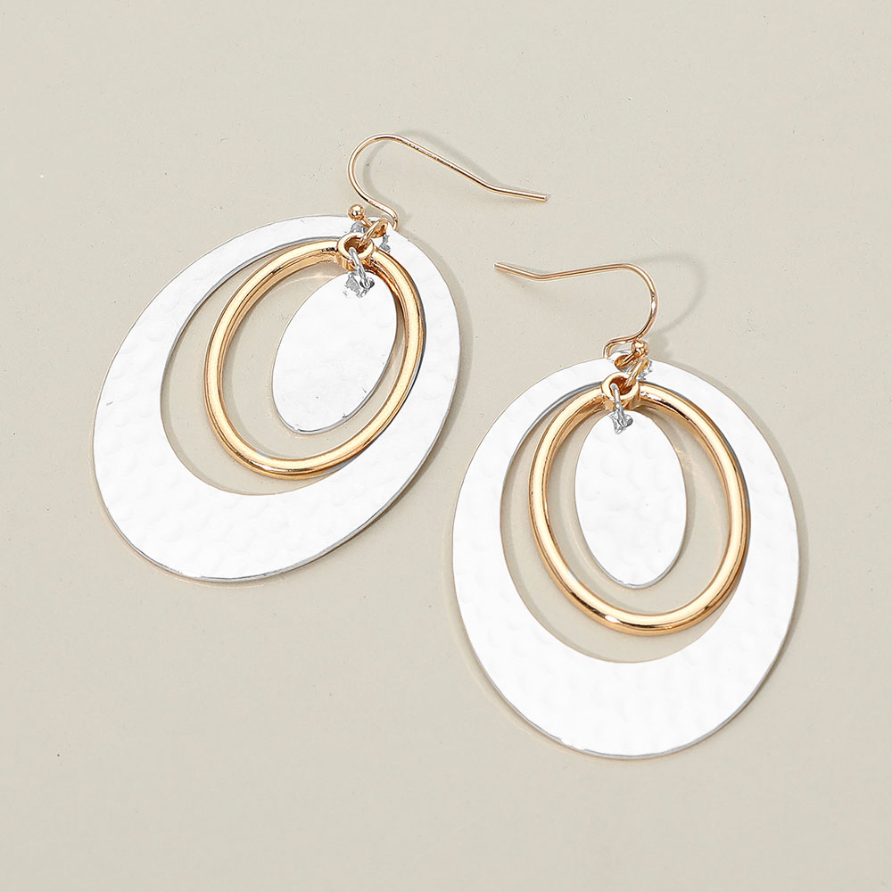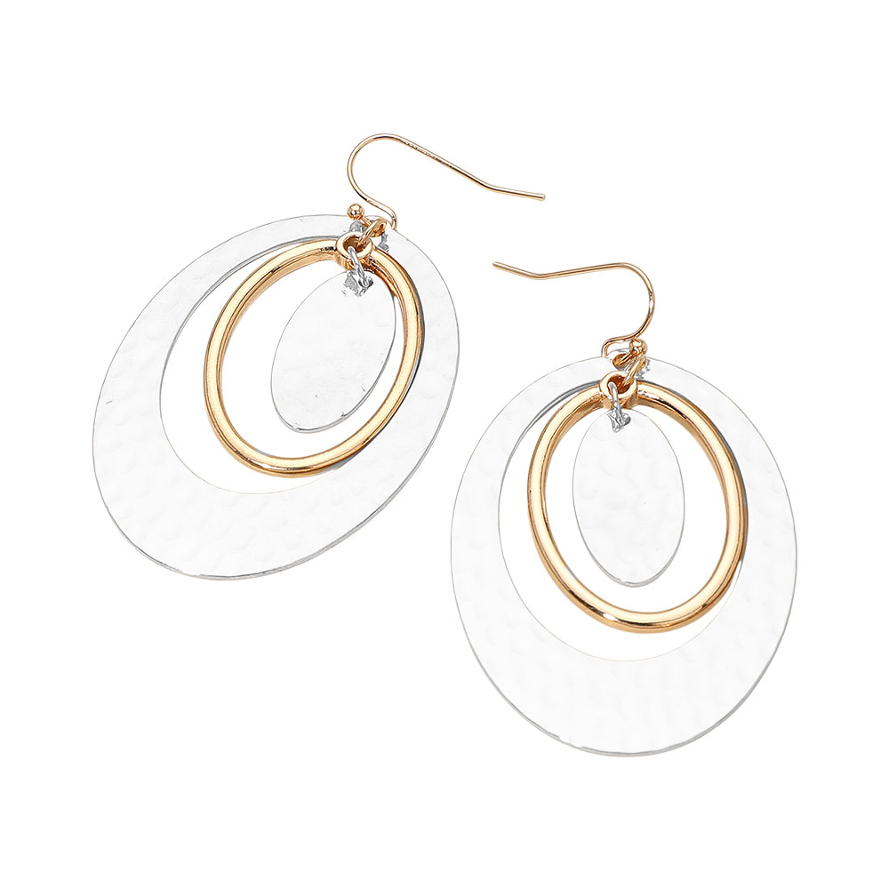 • Elevate your accessory game with these textured oval layered dangle earrings. Featuring interlocking open ovals with a subtle hammered finish, they blend modern sophistication with timeless elegance. Perfect for adding movement and shine to both casual and dressy looks.