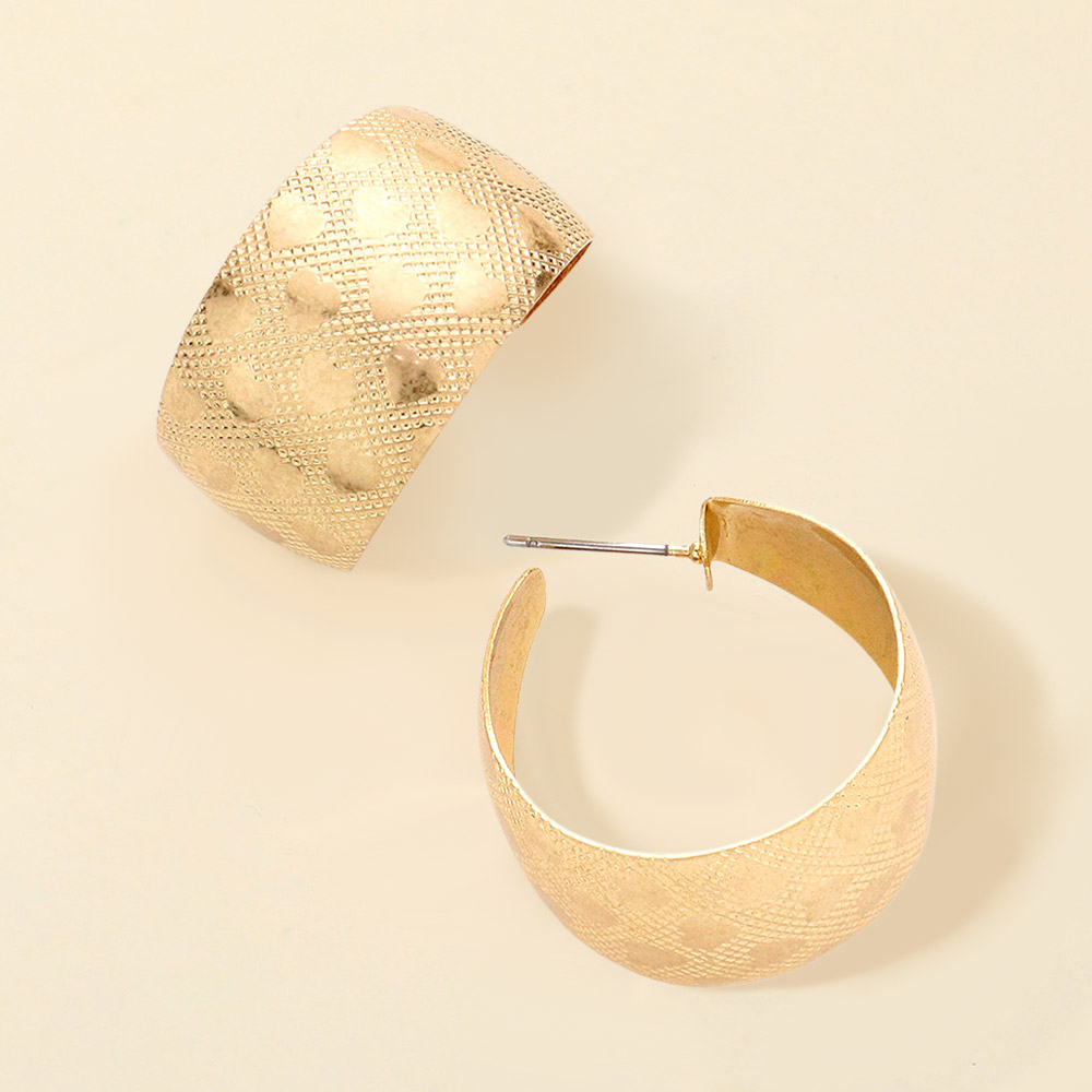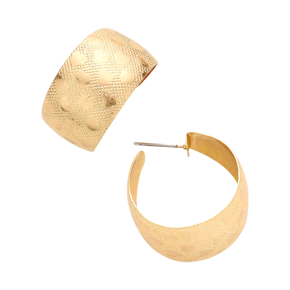 Details • Size : 0.6" X 0.9" • Post Back • Make a bold statement with wide textured hoop earrings featuring a unique patterned finish. Designed to add sophistication and contemporary edge, these hoops are perfect for elevating everyday looks or complementing chic evening outfits. • Lead and Nickel Compliant