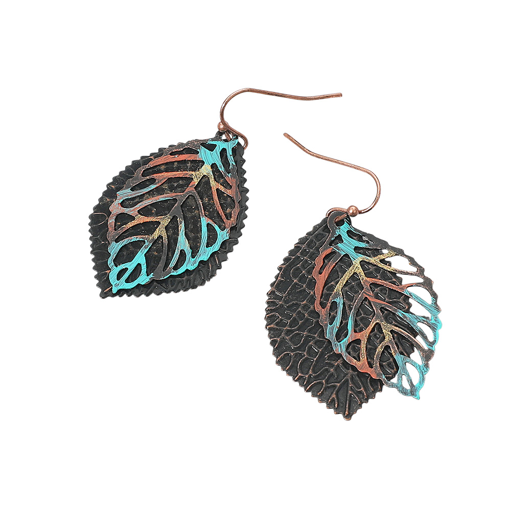 Details • Size : 1" X 1.8" • Fish Hook Back • Show off your artistic side with these layered leaf cutout dangle earrings, designed with intricate detailing and a rustic finish. Their nature-inspired shape brings a touch of bohemian charm, making them a perfect accessory for both everyday wear and statement looks. • Lead and Nickel Compliant